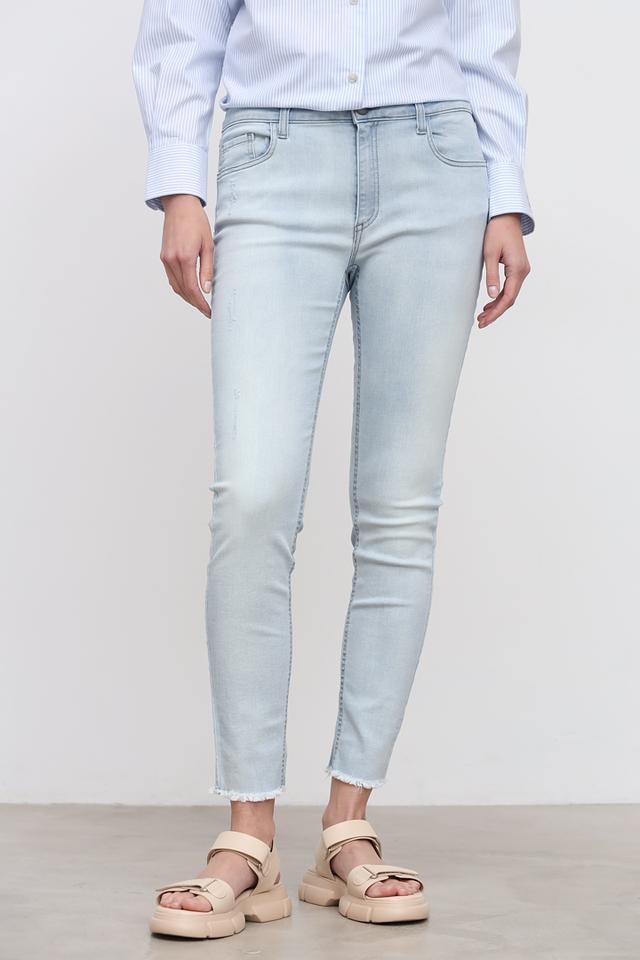 Особенностью этих джинсов являются декоративные потертости и необработанный край, придающие им непринужденный и современный вид. Они изготовлены из высококачественного хлопка с добавлением эластана, что обеспечивает комфорт при носке и хорошую посадку по фигуре.