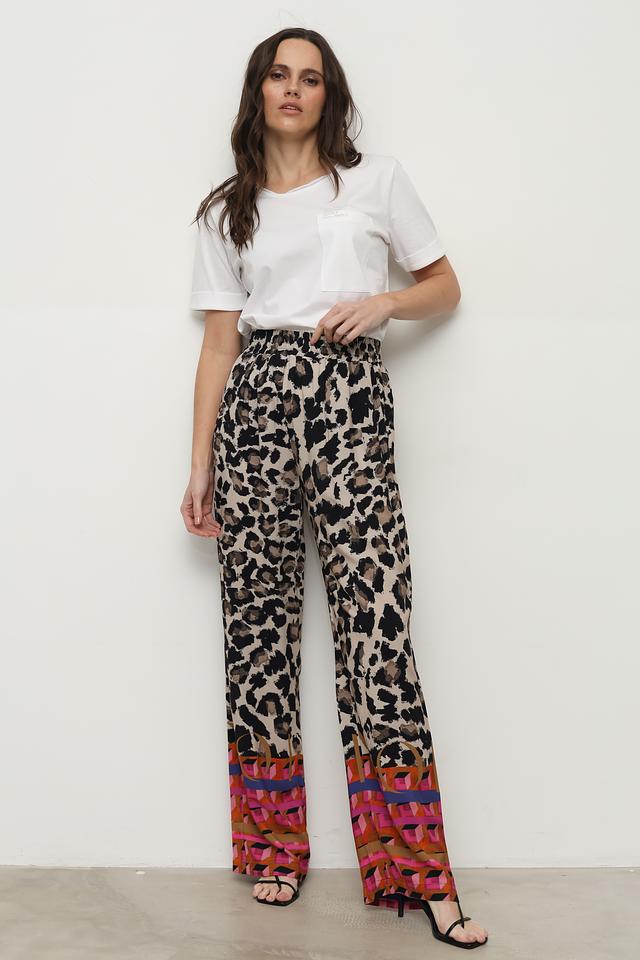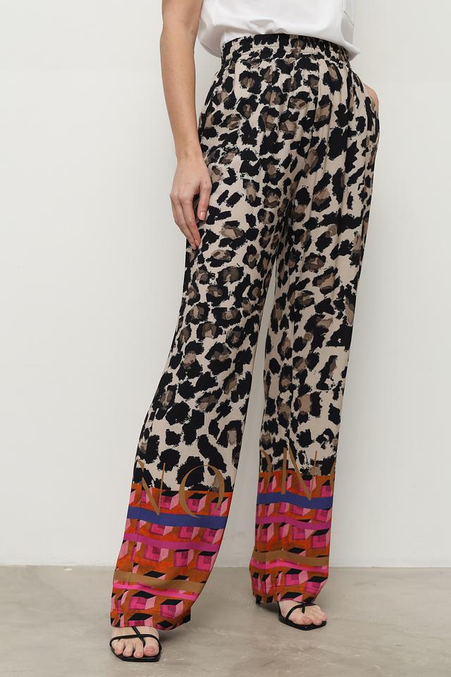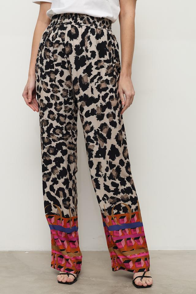 Брюки имеют свободный крой и эластичный пояс на талии, благодаря чему идеально сидят по фигуре. Верхняя часть брюк украшена классическим леопардовым принтом, а нижняя часть — оригинальным геометрическим узором в оранжево-розовой гамме.