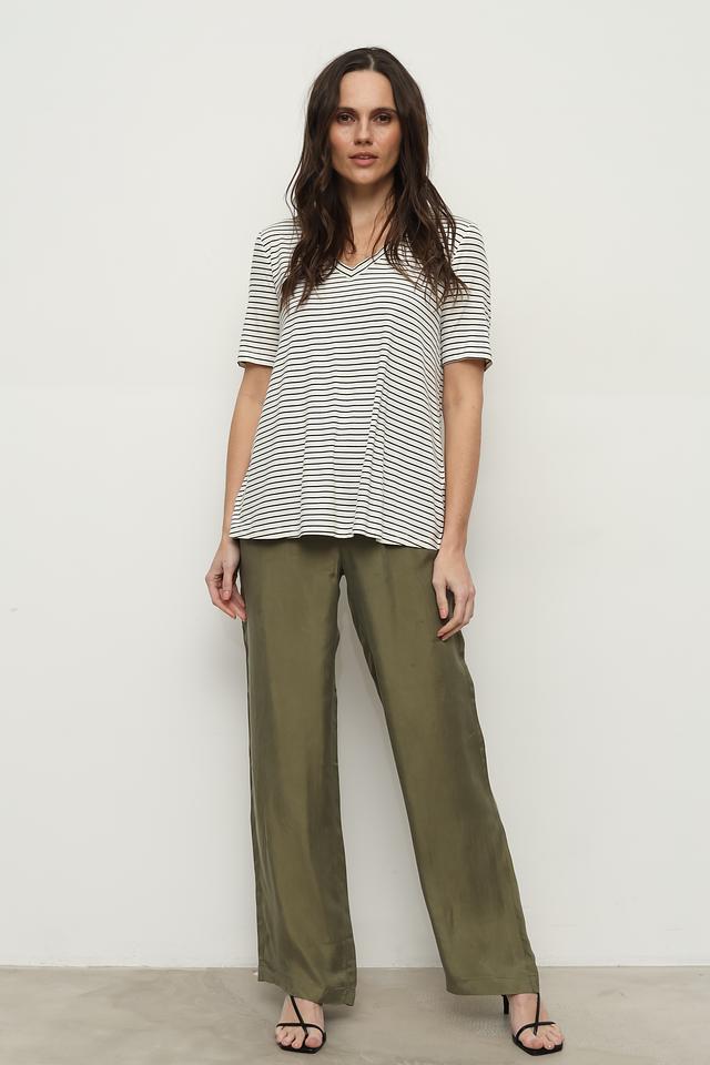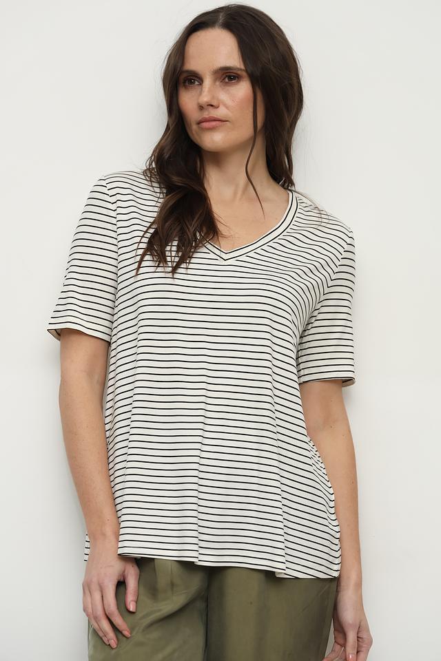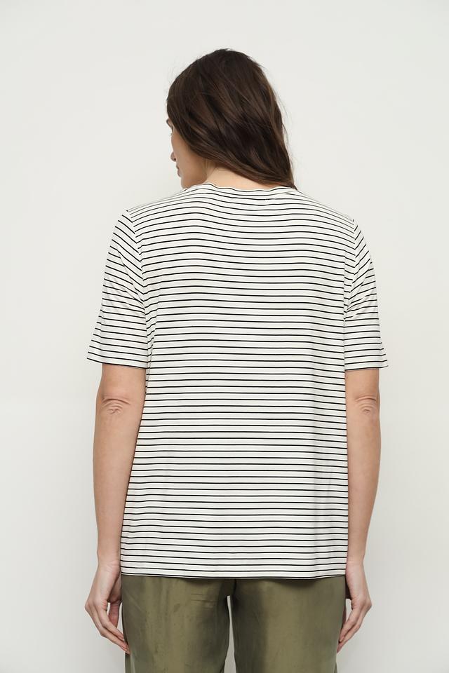 Футболка имеет классический прямой крой и короткий рукав. V-образный вырез горловины подчеркивает женственность силуэта. Особенностью данной модели является полосатый принт в сочетании белого и черного цветов, который легко сочетается с различными элементами одежды.