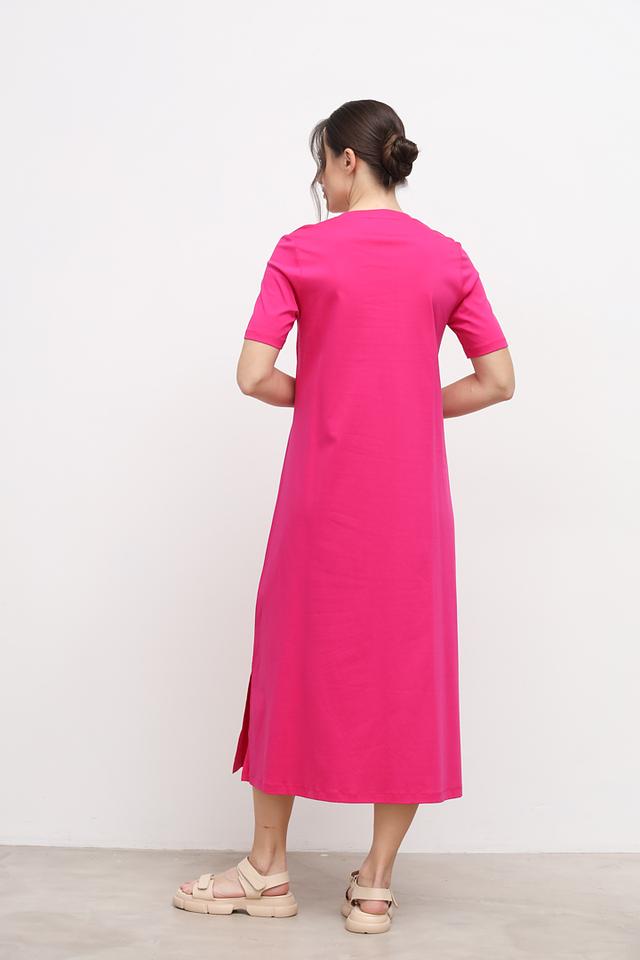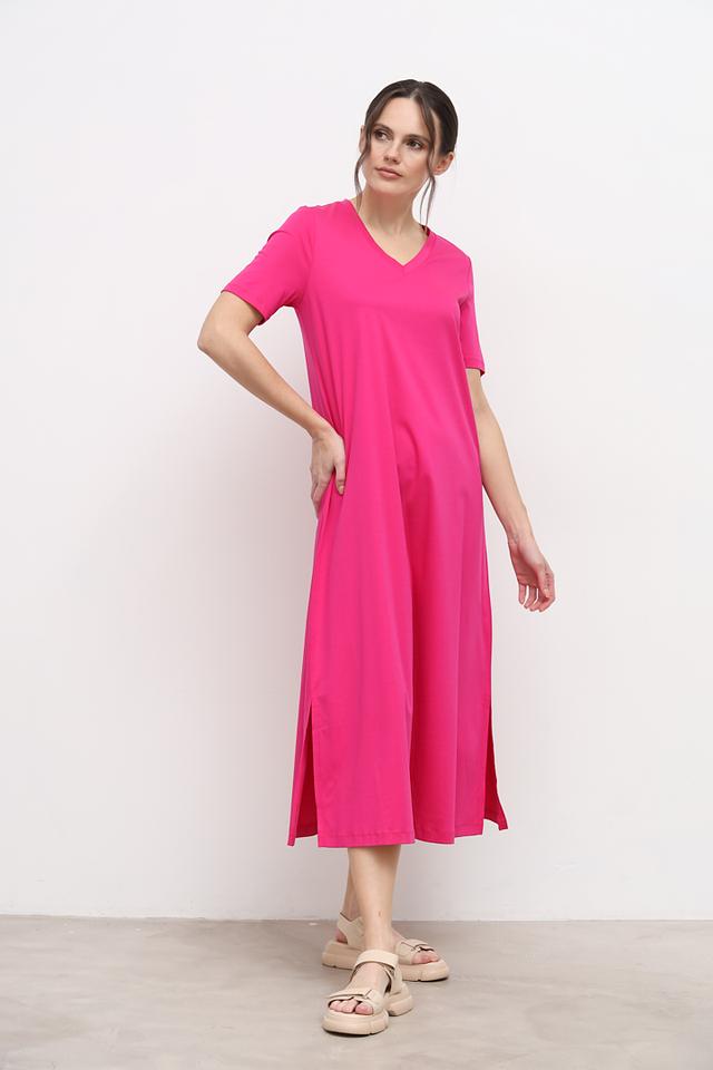 Платье Catnoir фуксия – это стильное и комфортное платье из 100% хлопка с V-образным вырезом и короткими рукавами. Платье имеет прямой силуэт и длину миди, а также небольшой разрез сзади. Состав: хлопок 100%