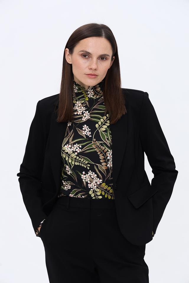Жакет выполнен из сочетания вискозы, нейлона и спандекса, что обеспечивает приятные тактильные ощущения, хорошую посадку по фигуре и лёгкость в уходе. Однобортная застёжка на пуговицу и аккуратный отложной лацкан добавляют модели элегантности.