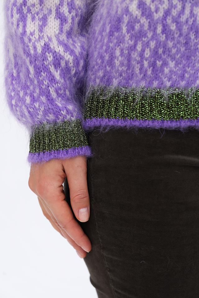 Пуловер имеет круглый вырез горловины и длинные рукава. В состав изделия входит акрил, мохер, полиамид, вискоза и эластан, что обеспечивает приятные тактильные ощущения, хорошую посадку по фигуре и устойчивость к деформации.