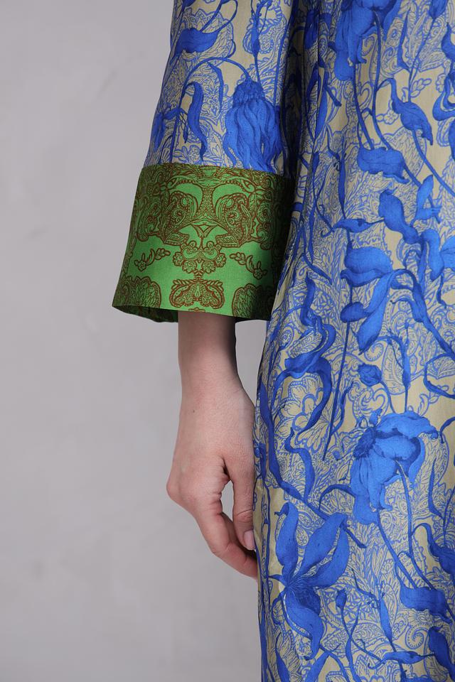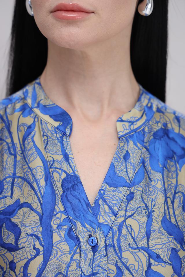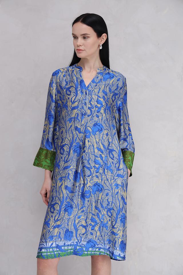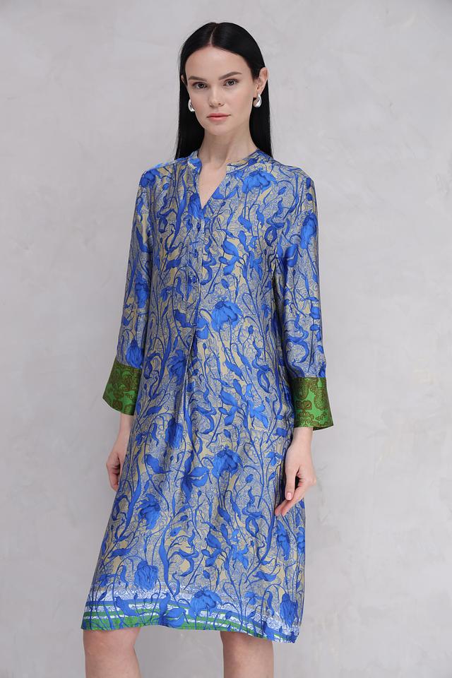Платье имеет прямой силуэт, V-образный вырез горловины и рукава длиной три четверти. Особенностью модели является яркий цветочный принт, сочетающий в себе оттенки синего, золотистого и зеленого. Присутствуют небольшие складки, добавляющие платью объем и легкость.