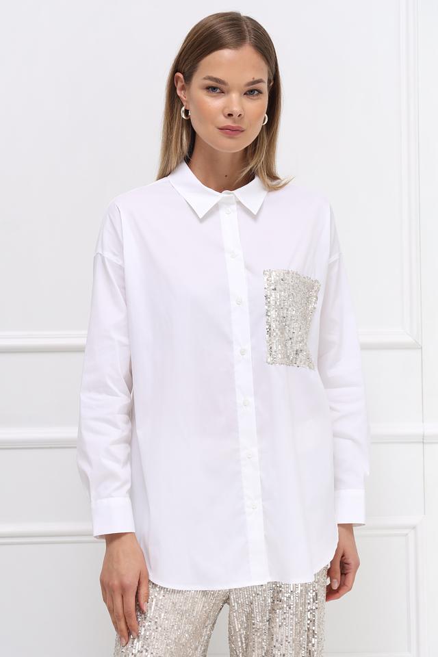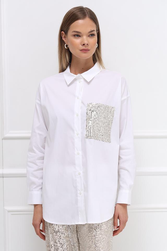 Особенностью модели является накладной карман с отделкой из сверкающих пайеток, который придает рубашке праздничный и нарядный вид. Рубашка идеально подойдет для создания как повседневных, так и вечерних образов.