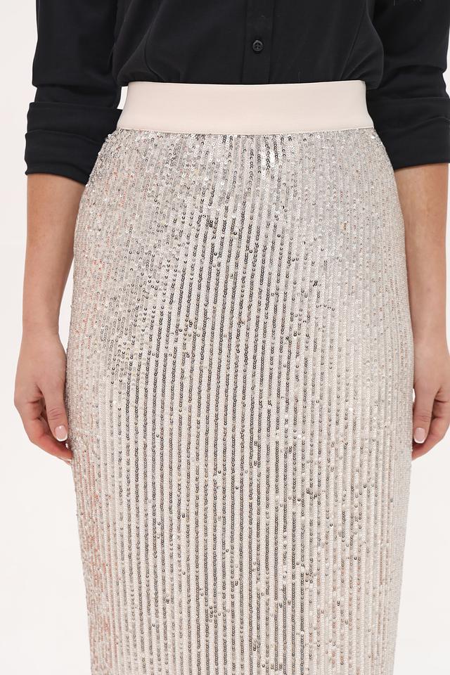 Основной материал юбки – это ткань, полностью покрытая мерцающими пайетками серебристого цвета. Высокая посадка и эластичный пояс обеспечивают удобство и подчеркивают талию. Классическая длина миди делает юбку универсальной и подходящей для различных случаев.
