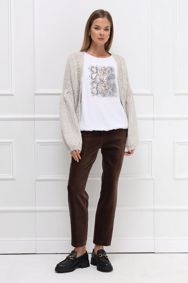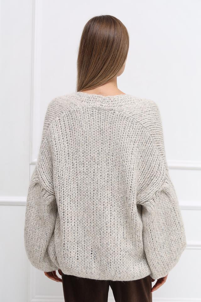 Жакет имеет широкие, слегка спущенные рукава, которые придают ему современный и расслабленный вид. Крупная вязка добавляет текстуры и объёма, а также обеспечивает дополнительное тепло в прохладную погоду.