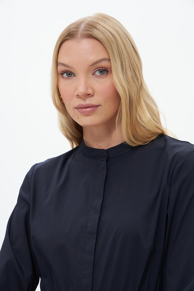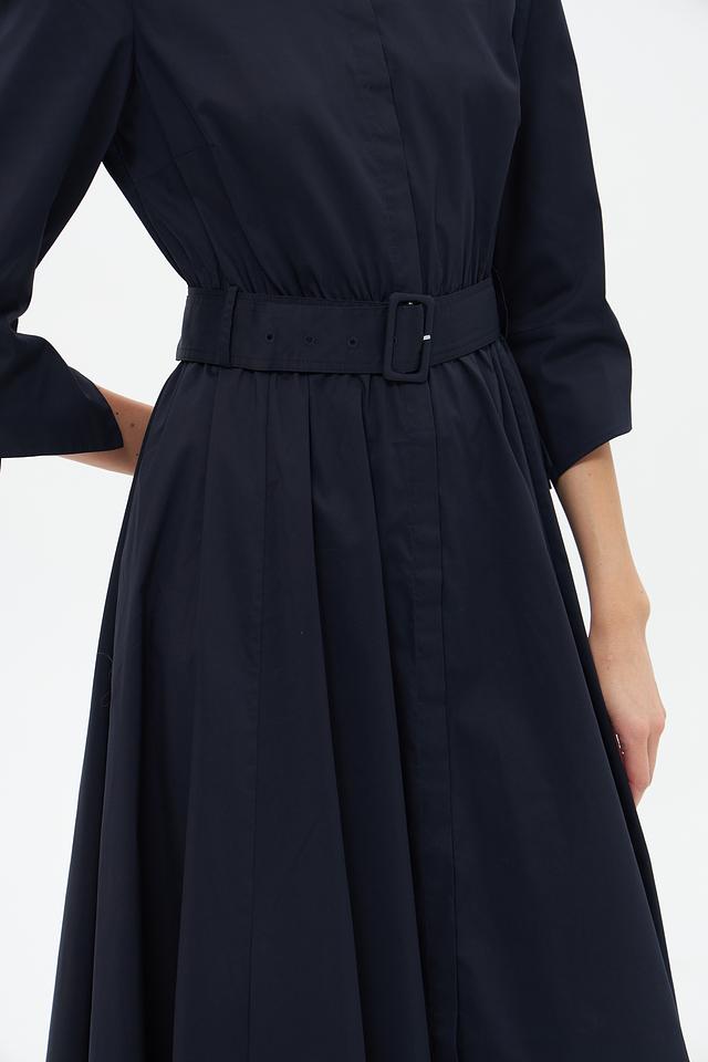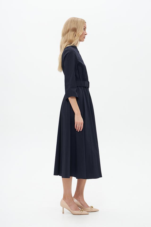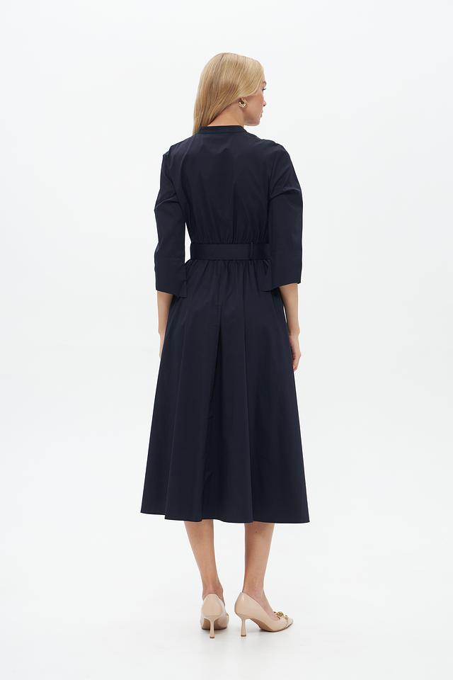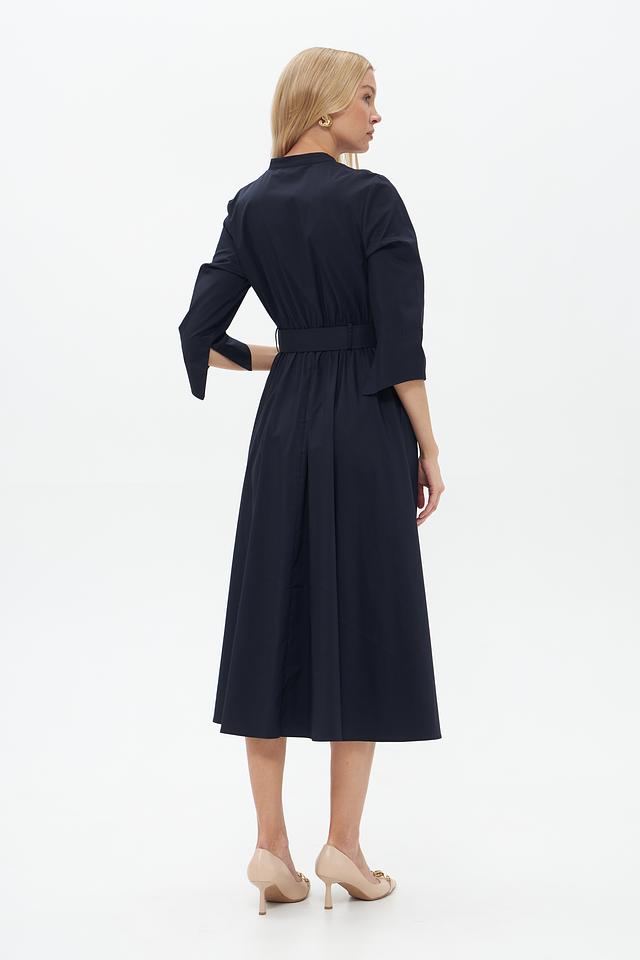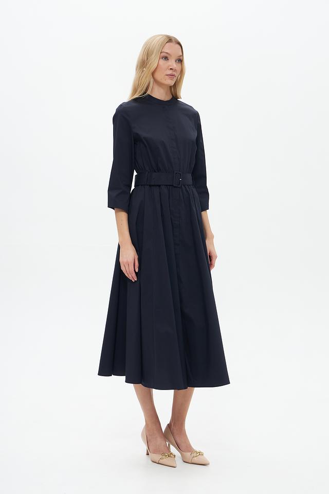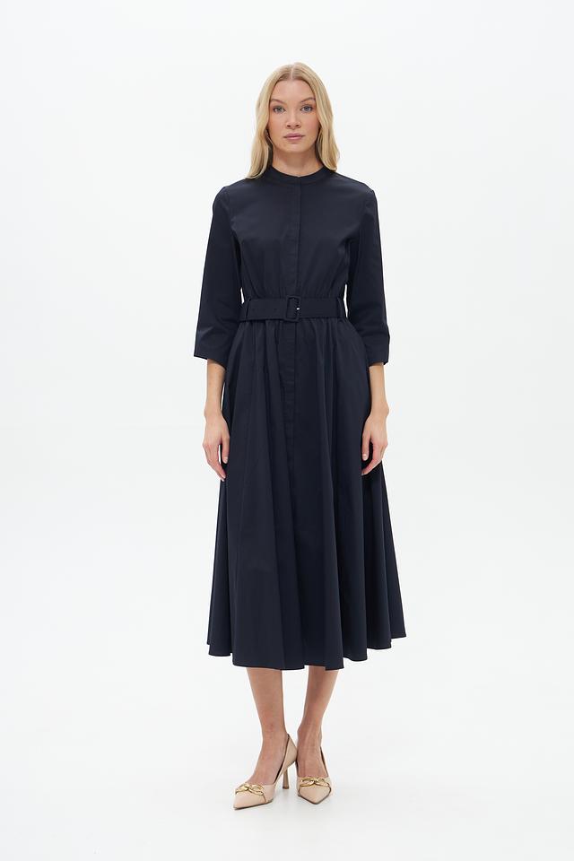 Тёмно-синее платье от Catnoir – элегантная модель длиной миди с рукавами 3/4 и акцентным поясом. Платье выполнено из плотной ткани, имеет воротник-стойку и застёжку на пуговицы. Состав: хлопок 74%, нейлон 23%, спандекс 3%