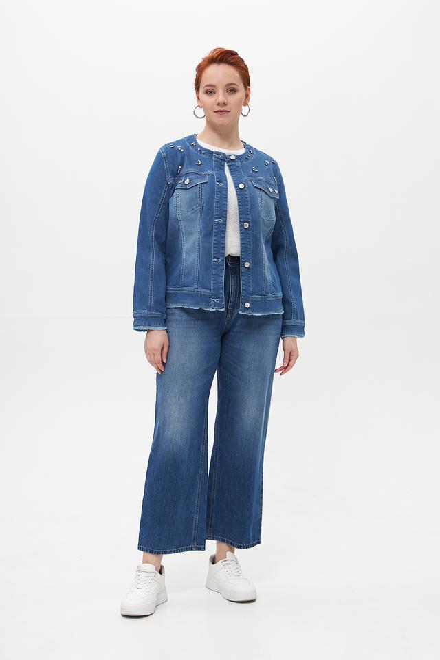 Джинсы имеют стандартную длину и застежку на пуговицу. На передних карманах присутствуют декоративные швы, добавляющие образу изюминку.