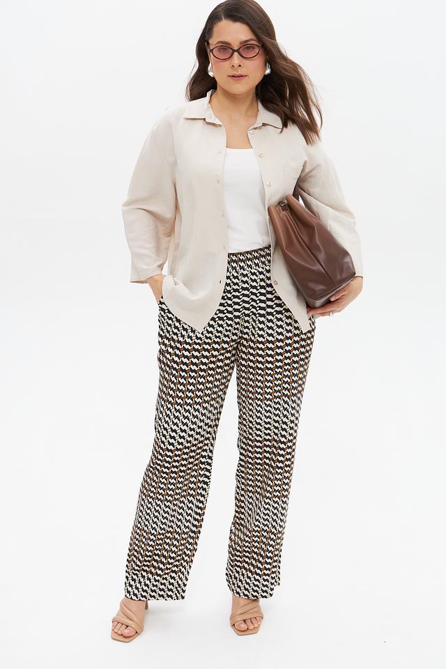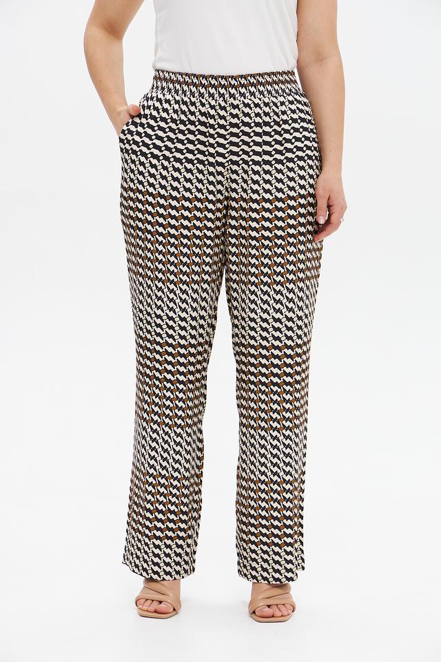 Особенностью модели является яркий геометрический принт, сочетающий в себе оттенки белого, черного и коричневого. Прямой крой и эластичный пояс на талии обеспечивают удобную посадку по фигуре.