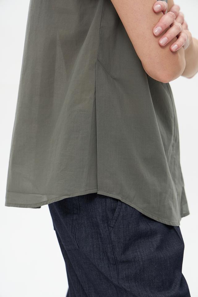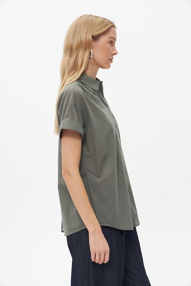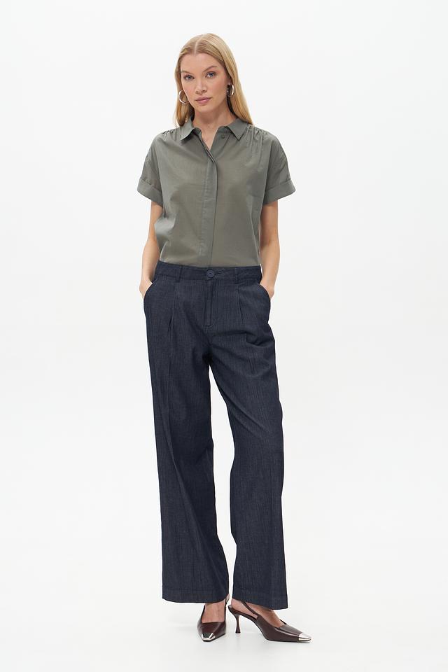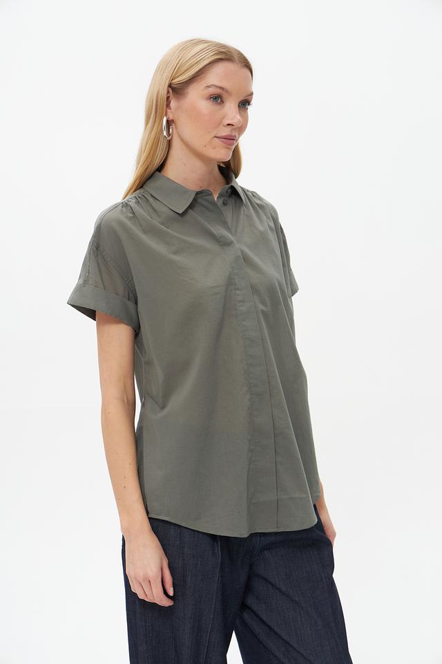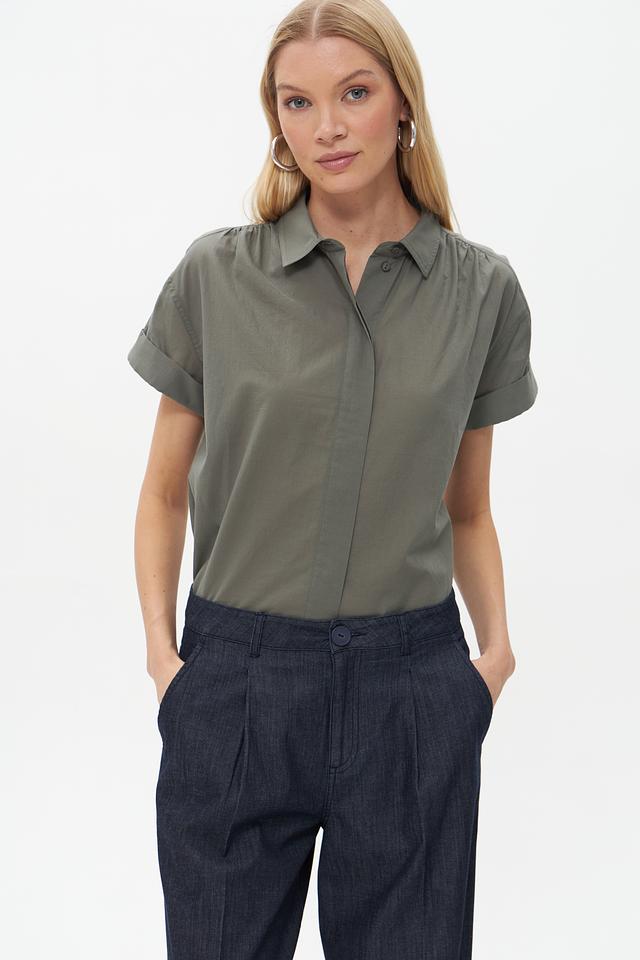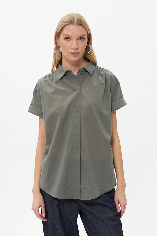 Цвет блузы – хаки, спокойный и универсальный оттенок, который легко сочетается с различными элементами гардероба. Благодаря своему лаконичному дизайну, эта блуза станет отличной базовой вещью в вашем шкафу.