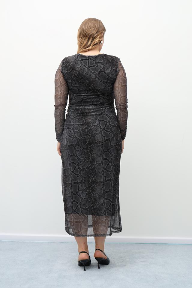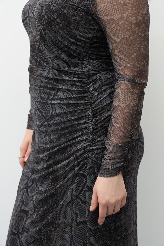 Модель имеет длину миди, длинные рукава из полупрозрачной сетки и приталенный силуэт. Сбоку на талии предусмотрена небольшая драпировка, которая визуально корректирует фигуру и добавляет образу женственности.