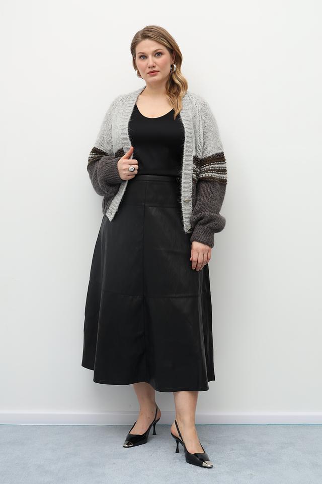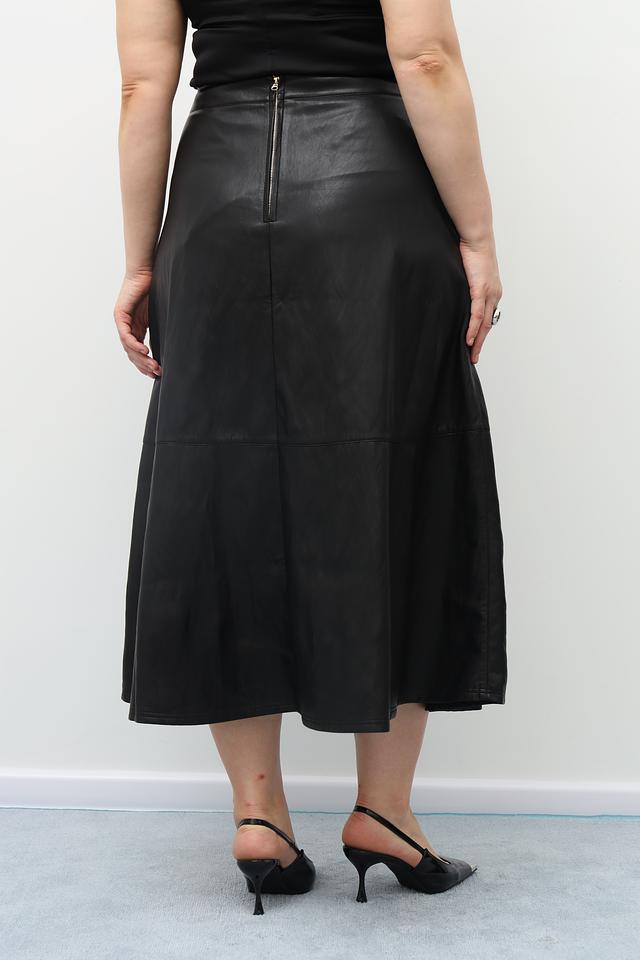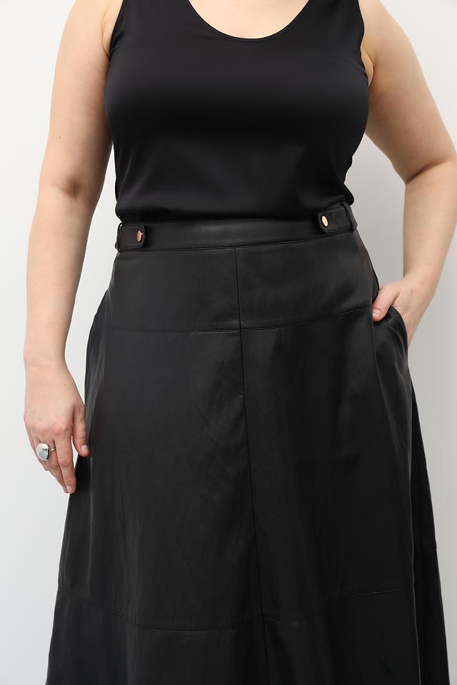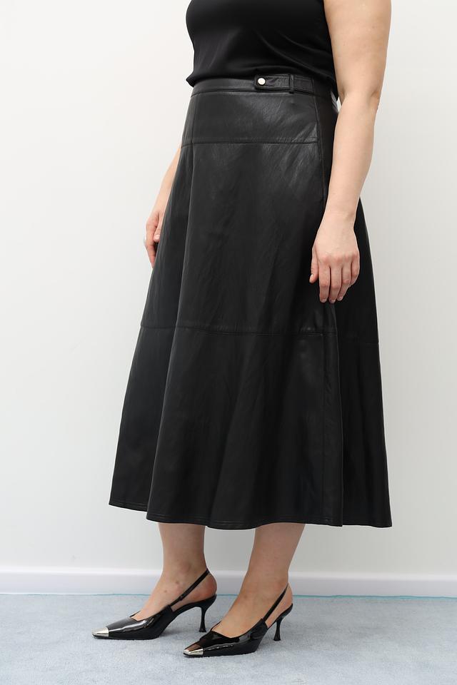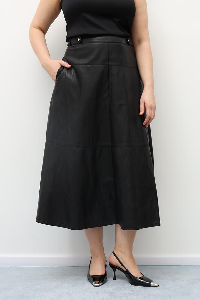 Чёрная юбка Catnoir из экокожи — стильный и универсальный элемент гардероба. Модель длиной миди и с умеренно расклешенным силуэтом идеально подойдёт для создания как повседневных, так и вечерних образов. Состав: хлопок 47%, полиуретан 45%, метализ.нить 8%