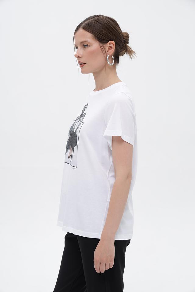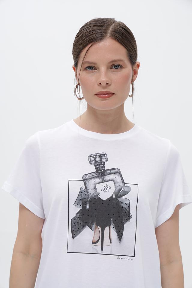Футболка украшена оригинальным графичным принтом в виде флакона духов, выполненным в черно-серых тонах. Принт придает образу изысканность и современность.