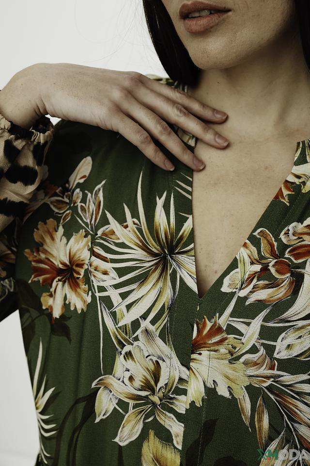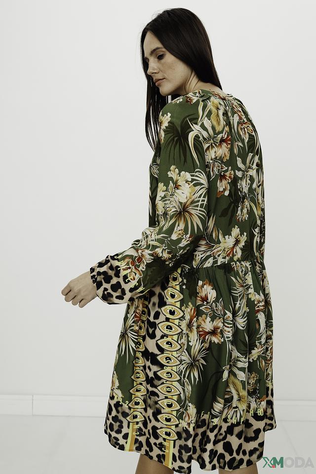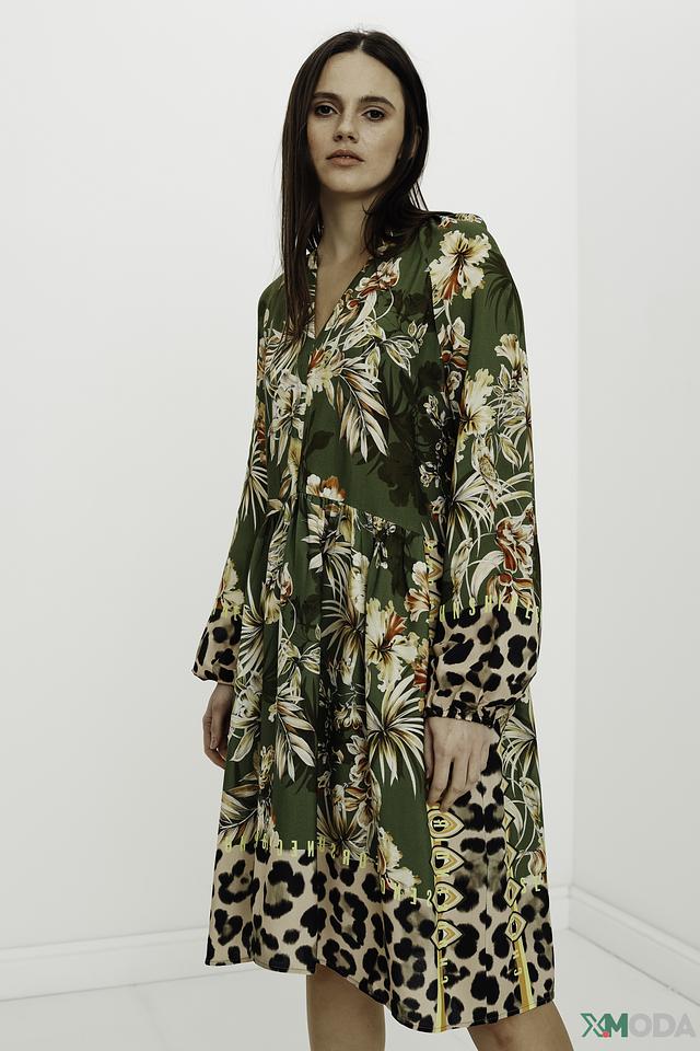 Платье имеет длинные рукава и V-образный вырез, подчеркивающий женственность силуэта. Оригинальный принт, сочетающий в себе цветочные мотивы и леопардовый узор, делает это платье уникальным и привлекательным.