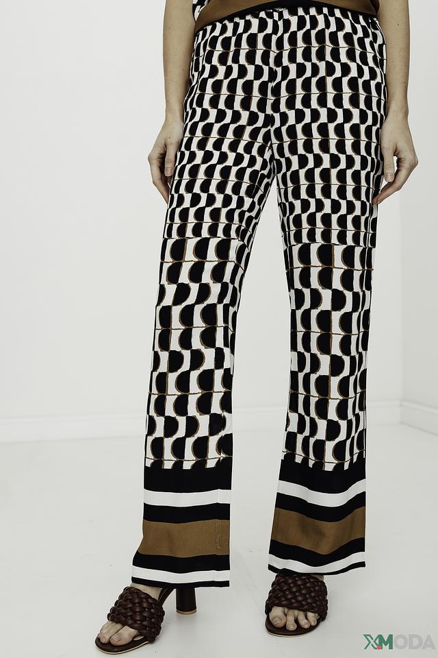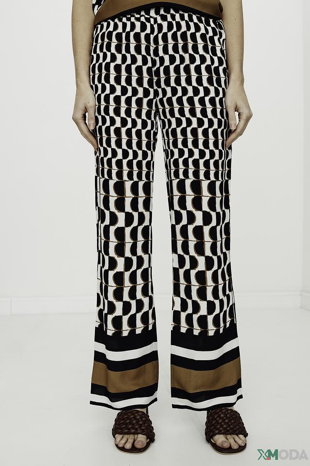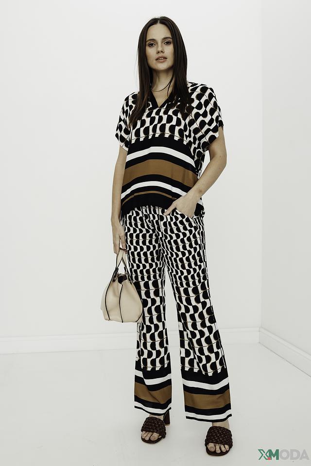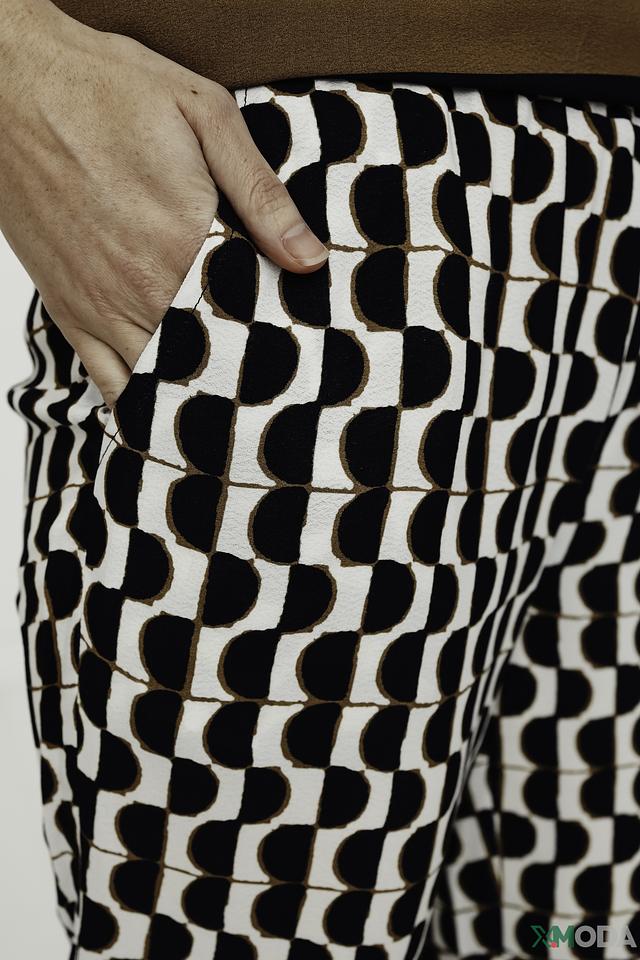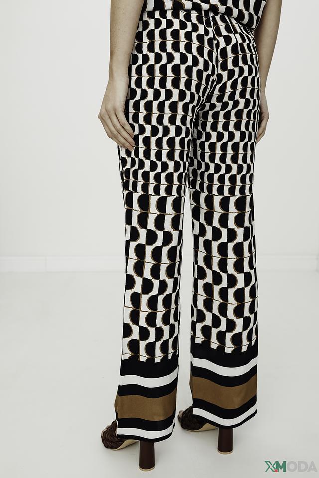 Брюки имеют прямой крой и широкие штанины, которые визуально удлиняют ноги и создают элегантный силуэт. Оригинальный геометрический принт в чёрно-белой гамме добавляет образу динамичности и современности.