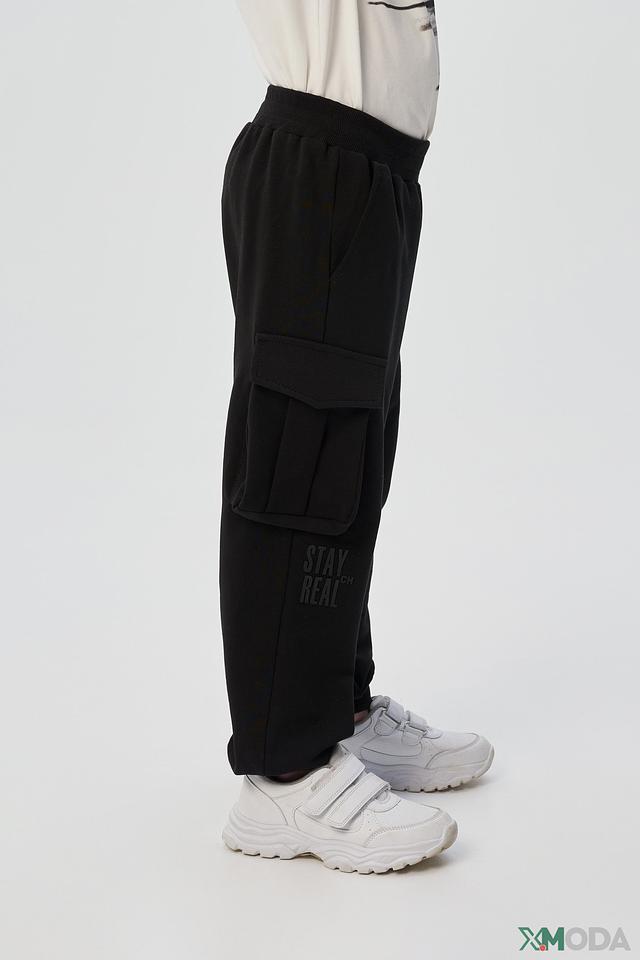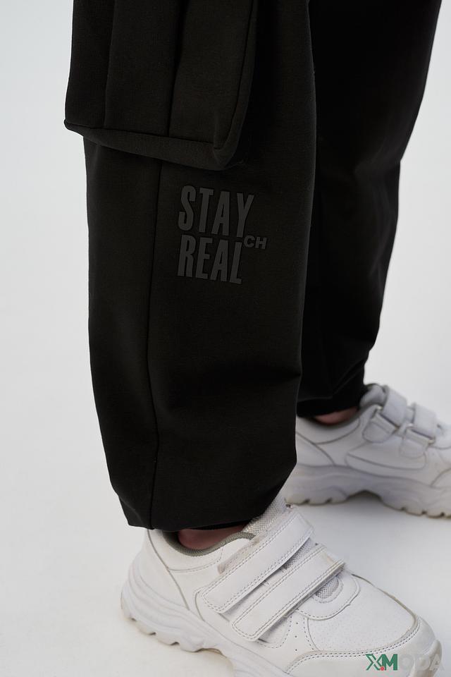 Особое внимание привлекают функциональные накладные карманы, выполненные в стиле карго, которые не только добавляют брюкам стильный вид, но и позволяют удобно хранить небольшие предметы. На левой штанине расположен контрастный принт с надписью “STAY REAL”, придающий образу индивидуальность. Данная модель идеально подходит для повседневной носки, активного отдыха и создания модных образов.