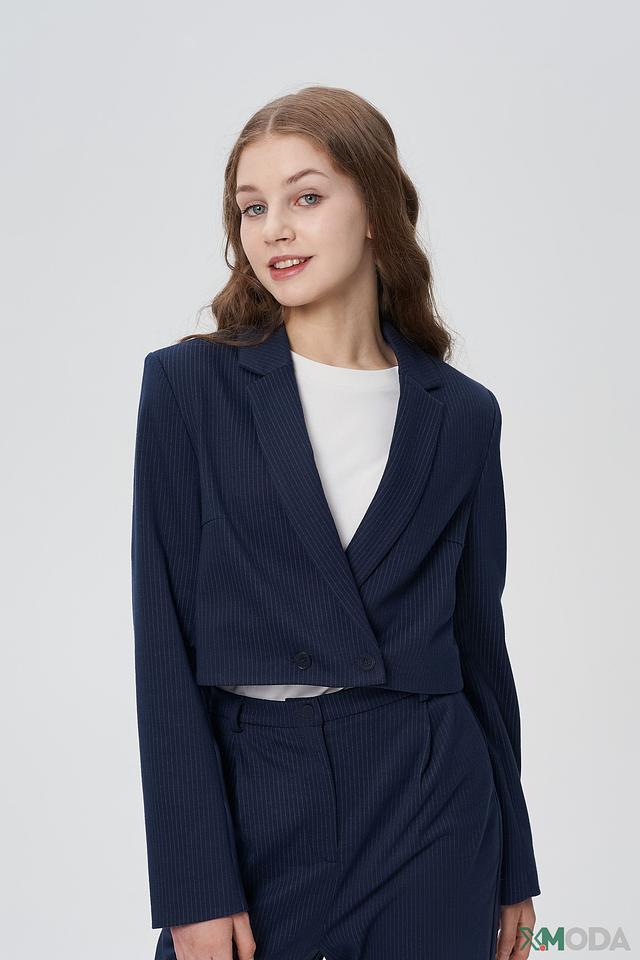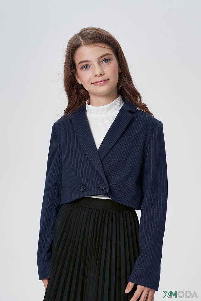 Кардиган имеет классический крой с лацканами и застежкой на пуговицы. Укороченная длина делает его идеальным для создания стильных школьных образов. Тонкая полоска добавляет изысканности и делает кардиган универсальным для сочетания с различными элементами гардероба.