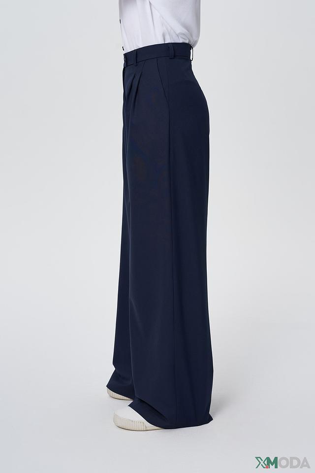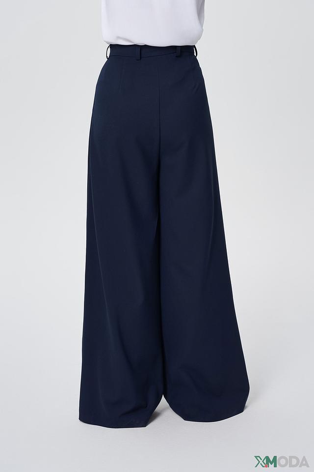 Брюки имеют широкий крой и прямые штанины, обеспечивающие комфорт и свободу движений. Пояс дополнен аккуратными защипами, придающими брюкам более элегантный вид. Застежка – молния и пуговица.