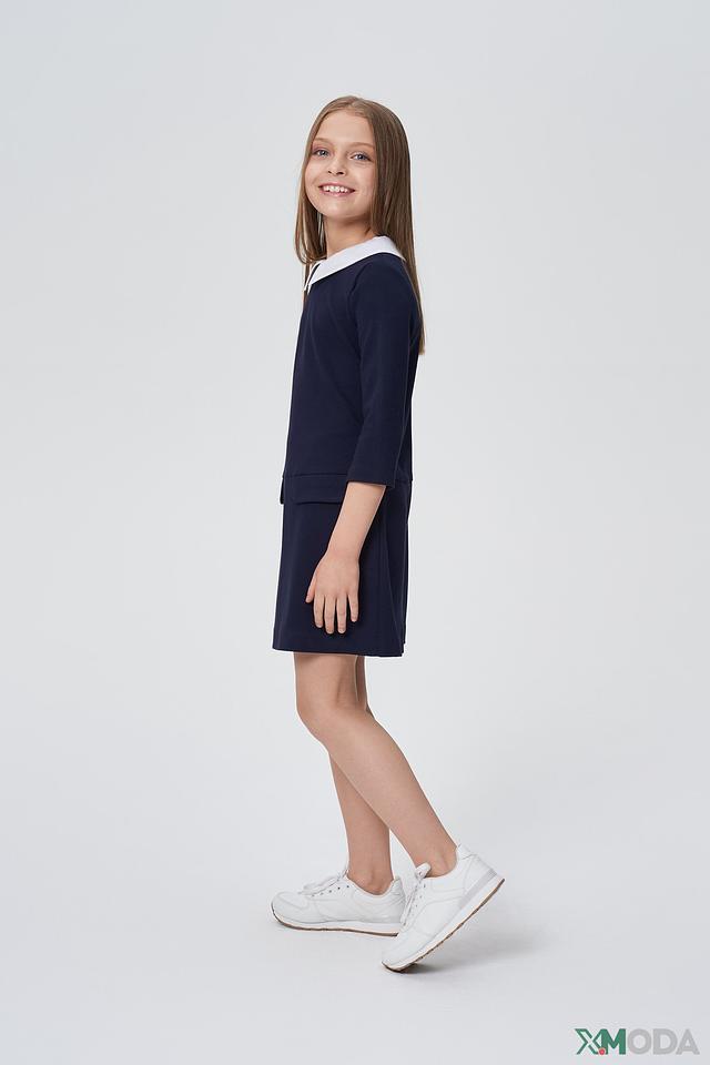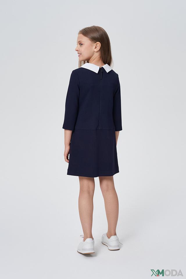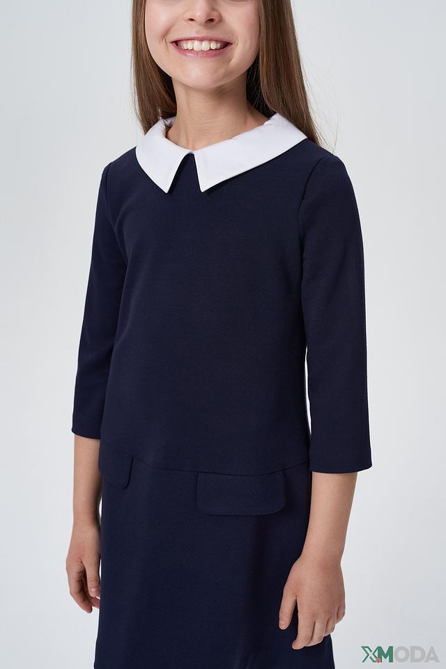 Платье Choupette для девочки, синего цвета, с контрастным белым воротником. Стильная модель с рукавами 3/4 и удобными карманами. Идеально подходит для школьной формы или повседневной носки. Состав: вискоза 64%, полиэстер 32%, полиуретан 4%