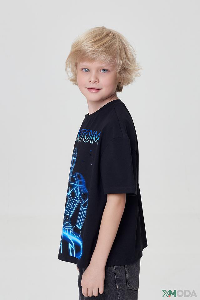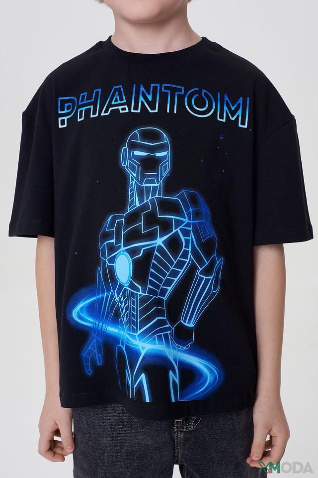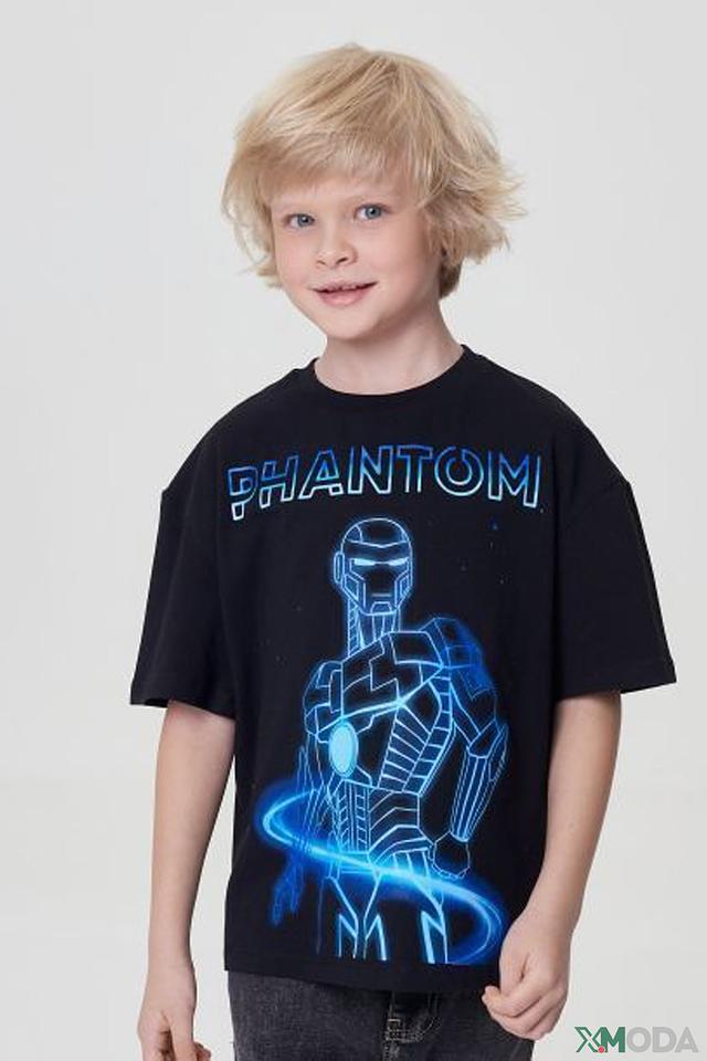 Футболка имеет классический крой с круглым вырезом горловины и короткими рукавами. Основным акцентом является яркий принт «Phantom» с изображением героя в голубых тонах, который добавит образу ребёнка индивидуальности и динамики. Принт выполнен с использованием современных технологий, что гарантирует его стойкость к стирке и износу.