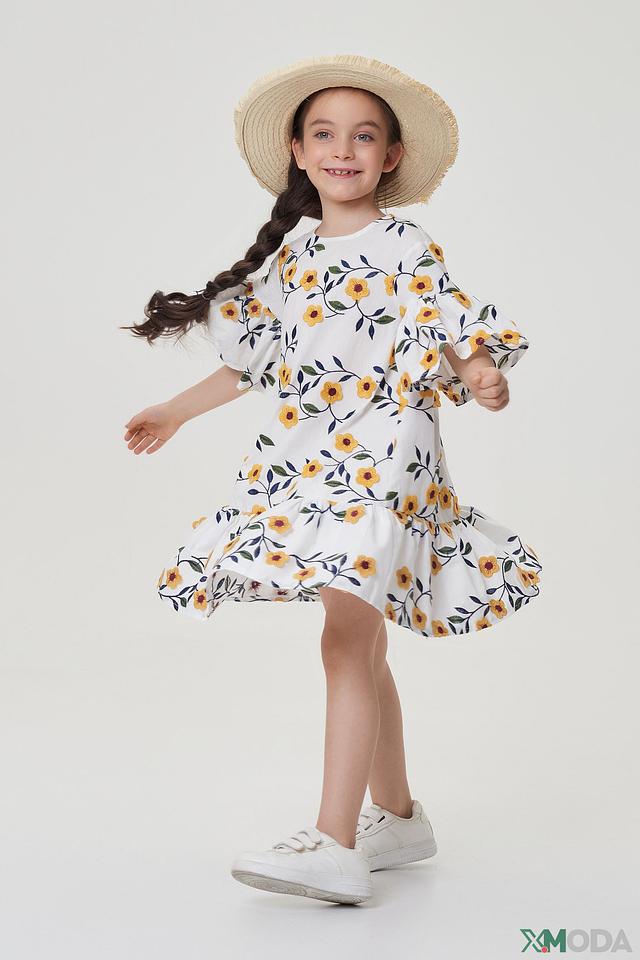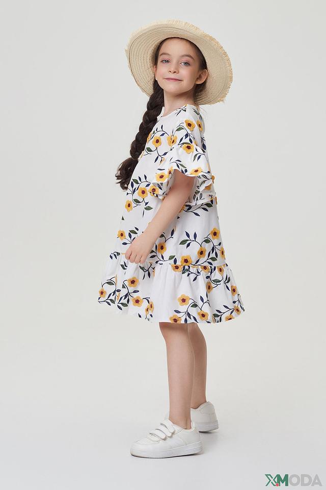Модель имеет свободный крой, не сковывающий движений, и короткие рукава с воланами, придающими образу игривость. Юбка платья собрана на мягкую резинку, обеспечивая комфортную посадку. Платье изготовлено из 100% хлопка – натурального, дышащего и приятного к телу материала.