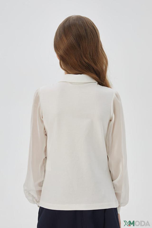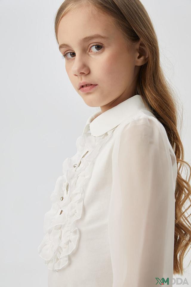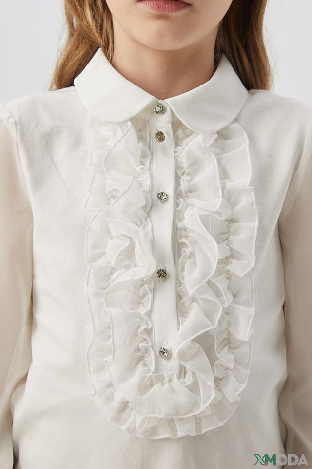 - Изысканный дизайн. Декоративные вертикальные сборки и блестящие стразы на пуговицах делают эту школьную блузку нарядной, подчеркивая классический стиль и добавляя праздничности.