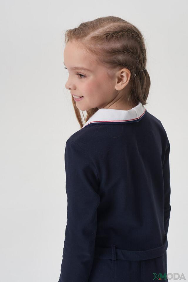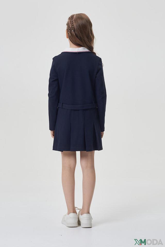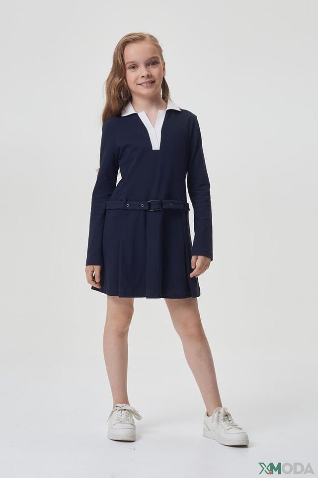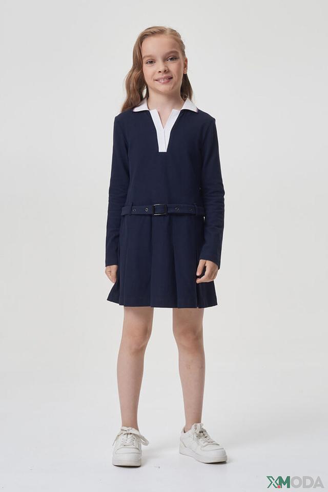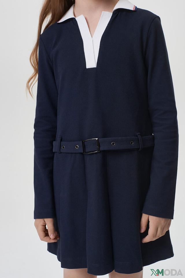 Модель имеет длинные рукава и аккуратный воротничок белого цвета, что придает ей школьный стиль. Талия подчеркнута поясом, который можно завязать на бантик или оставить прямым. Юбка платья слегка расклешена, что обеспечивает свободу движений.