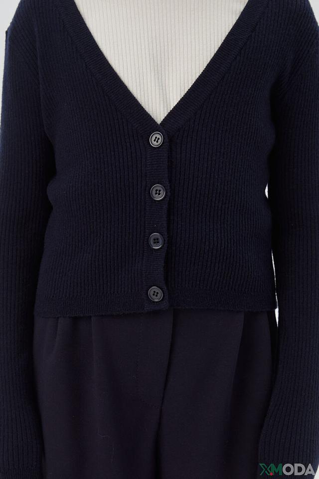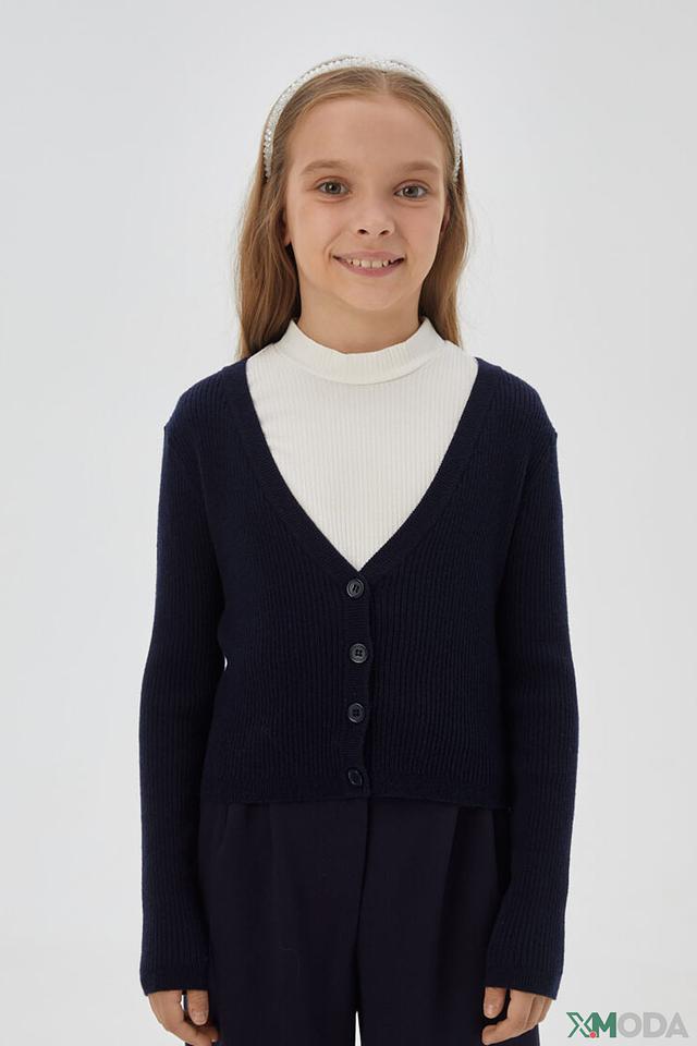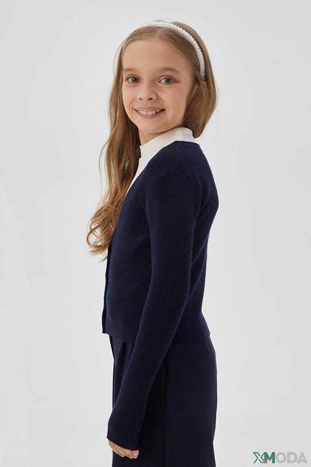 Кардиган имеет удобный V-образный вырез и застегивается на ряд пуговиц. Трикотажная структура обеспечивает комфорт и свободу движений, что особенно важно для активных детей. Модель имеет длинные рукава и слегка укороченный силуэт.