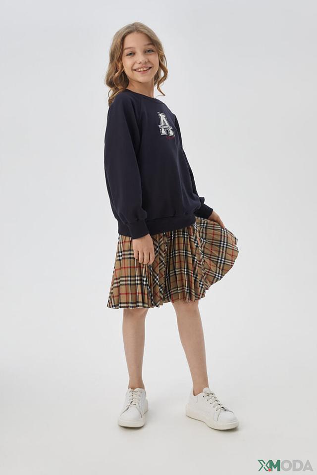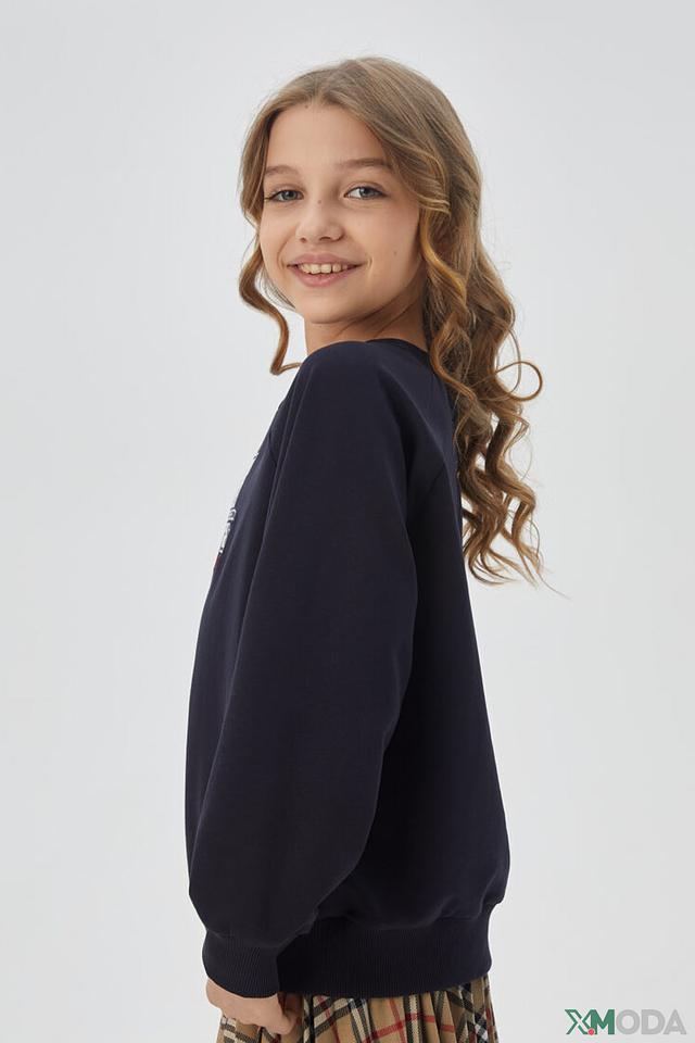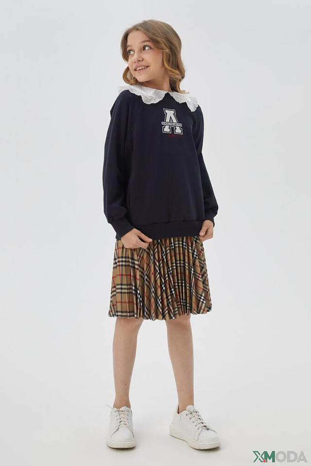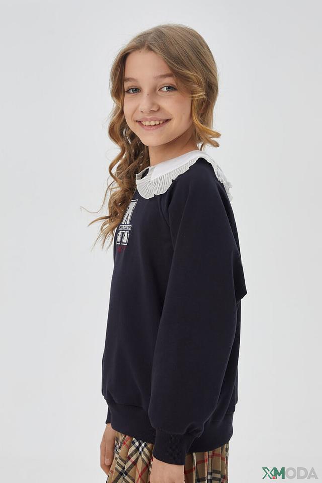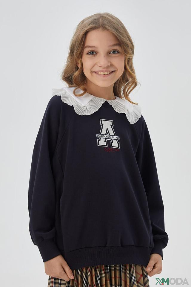 Пуловер имеет круглый вырез горловины, украшенный аккуратным белым воротником-жабо, который придает образу нежность и изысканность. На передней части изделия расположен яркий принт "School Collection", выполненный в белых и красных тонах.