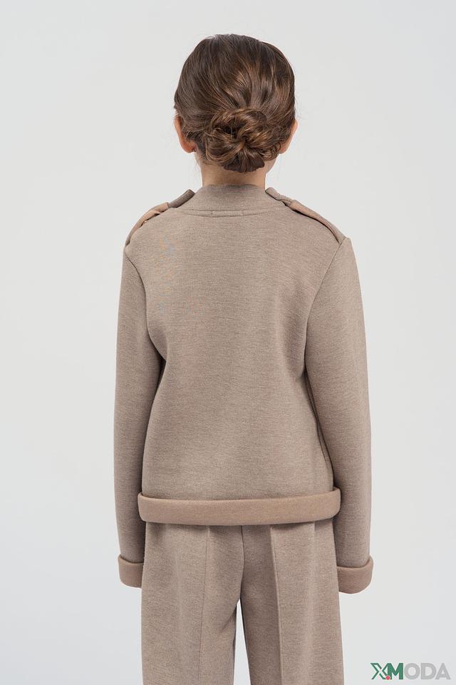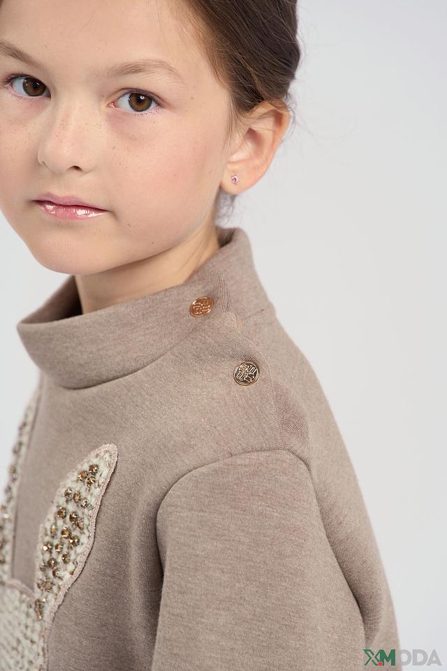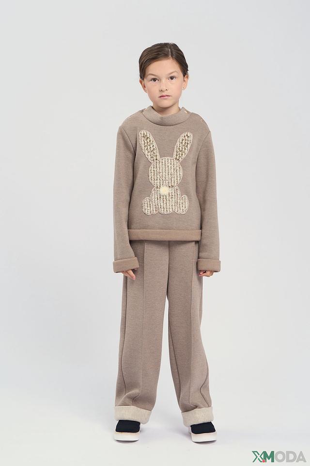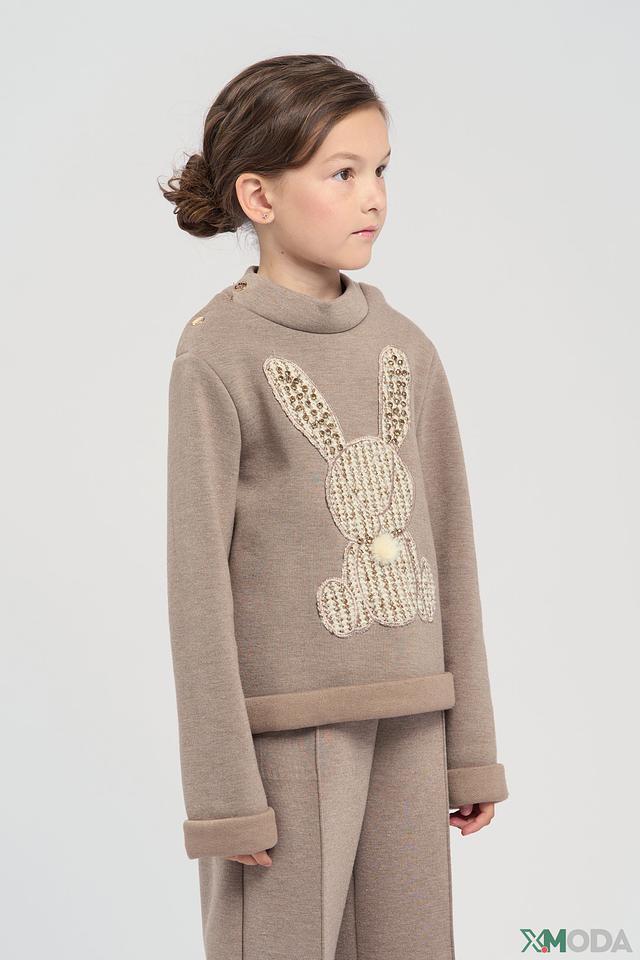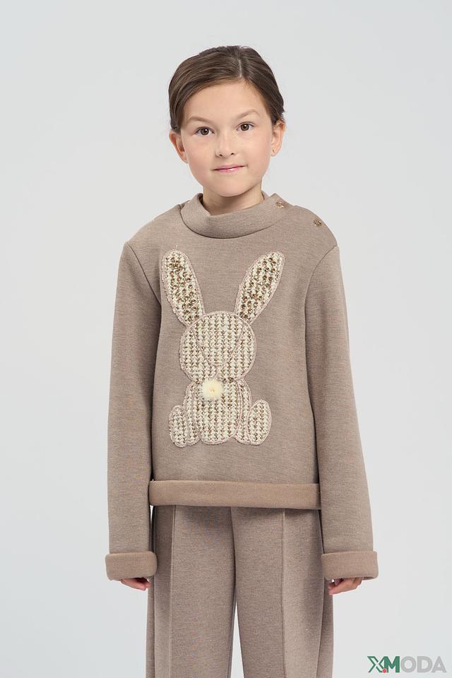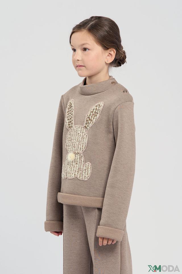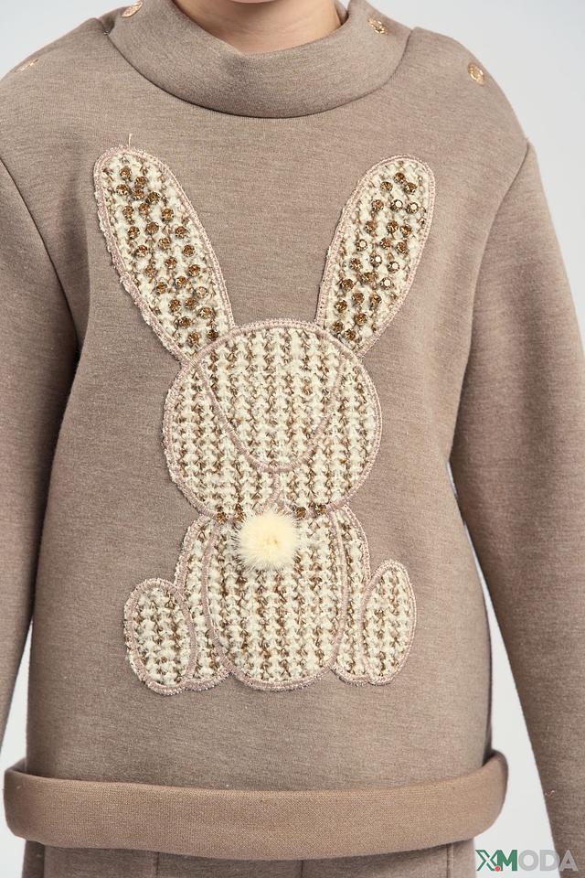Джемпер имеет бежевый цвет, который легко сочетается с другими элементами одежды. Передняя часть украшена аппликацией в виде милого зайчика, выполненной из фактурного вязаного материала с добавлением блестящих элементов. Воротник оформлен декоративными пуговицами.
