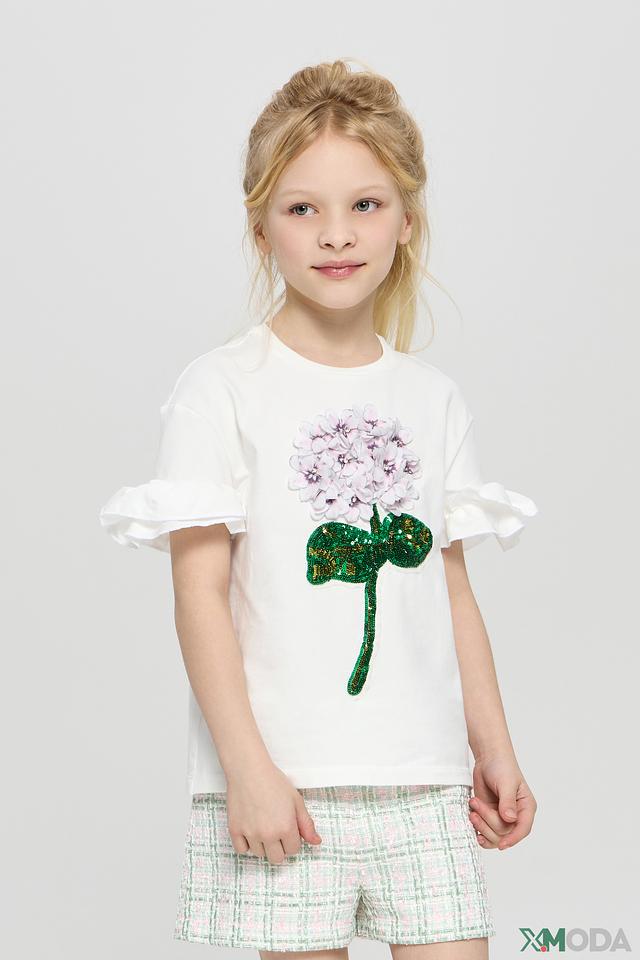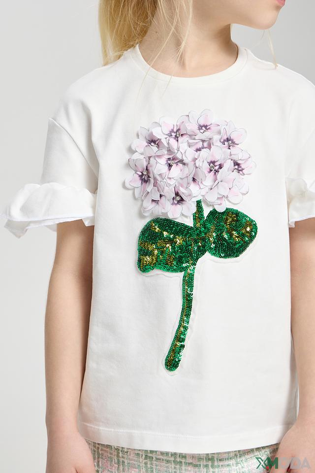 Эта очаровательная футболка от Choupette станет прекрасным дополнением к гардеробу юной модницы. Футболка выполнена в белом цвете и украшена аппликацией в виде нежного цветка с блестящими лепестками и зеленым стеблем.
