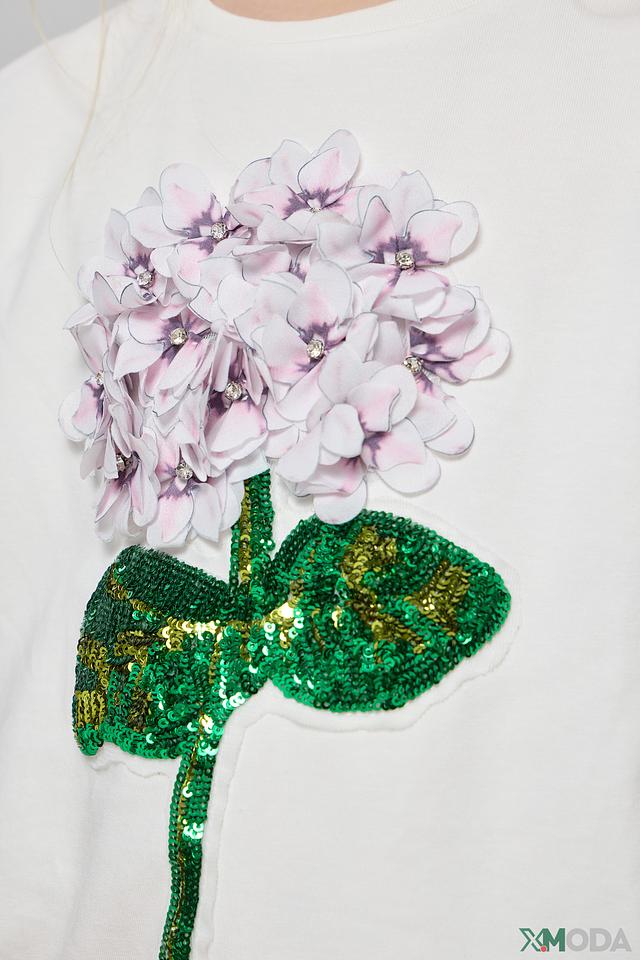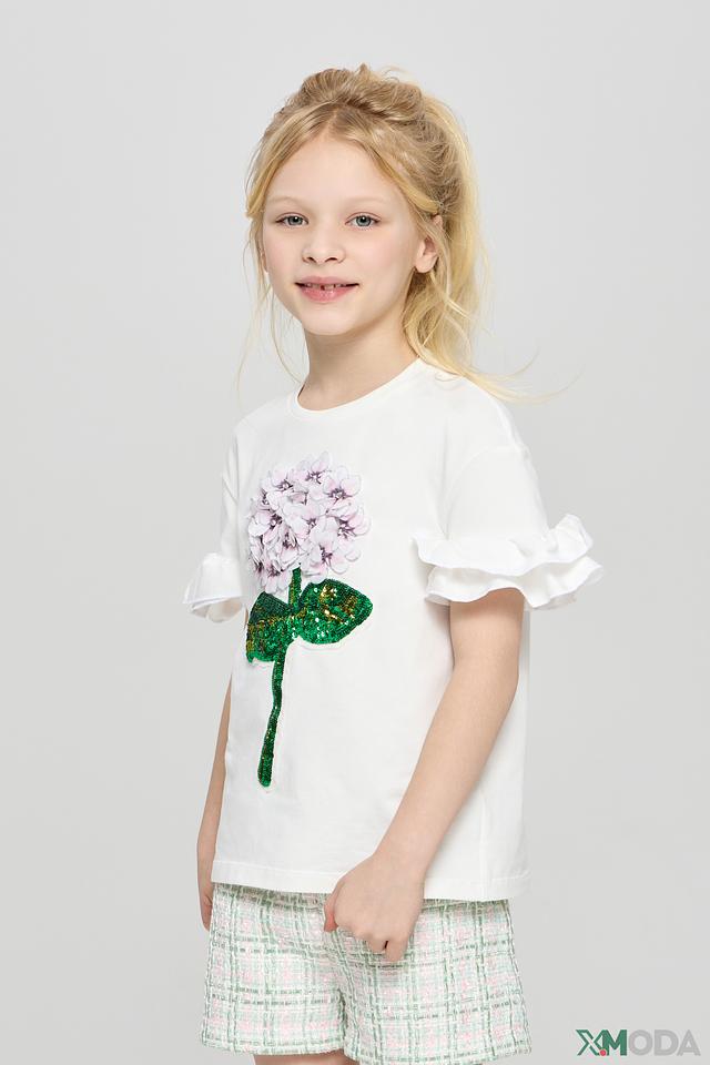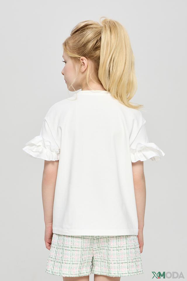 Модель имеет короткие рукава с воланами, что придает ей игривый и женственный вид. Футболка выполнена из высококачественного хлопка, который приятен к телу и обеспечивает комфорт в течение всего дня. Небольшой процент полиуретана в составе ткани добавляет ей эластичности и износостойкости.