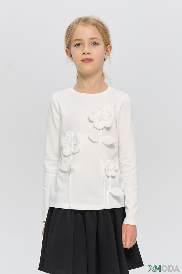 Основным акцентом модели являются объёмные, декоративные цветы, расположенные на лицевой стороне. Они придают образу нежность и романтичность. Футболка изготовлена из высококачественного хлопка (90%) с добавлением полиуретана (10%), что обеспечивает комфорт при носке, мягкость и хорошую посадку по фигуре.