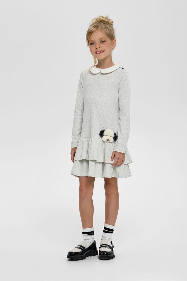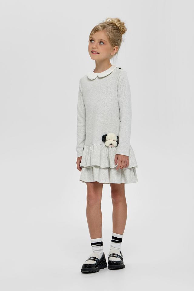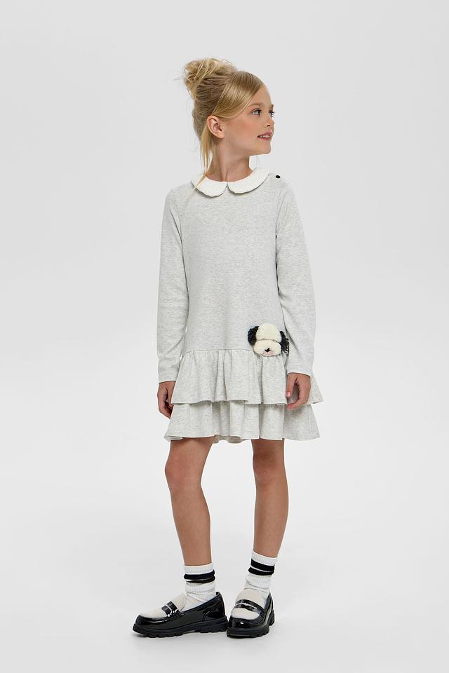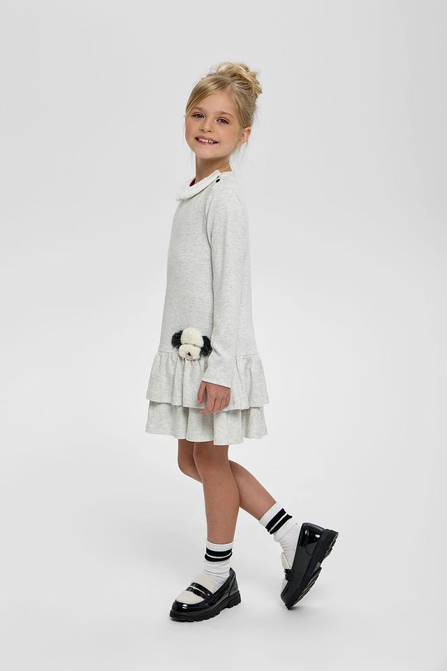 Платье имеет длинный рукав и аккуратный воротник-стойка, выполненный из контрастной ткани. Оригинальным акцентом является аппликация в виде милой панды, которая расположена на юбке.