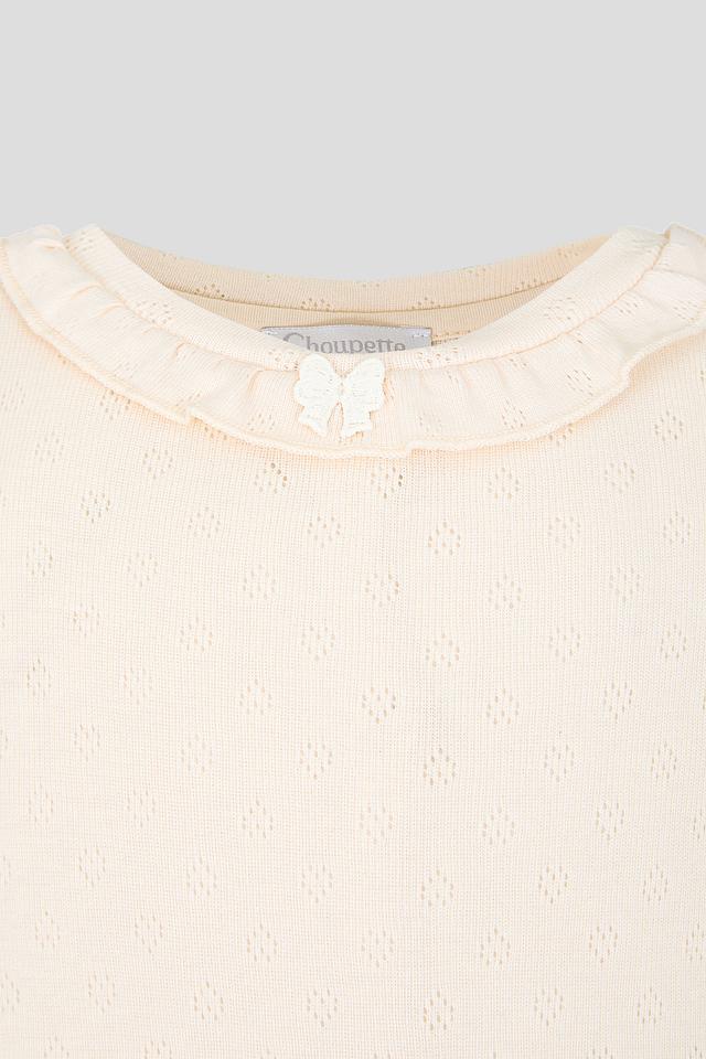 Особый акцент в дизайне боди – это нежная оборка и милый бантик на горловине, которые придают образу девочки очарование и нежность. Боди легко надевается и снимается, обеспечивая удобство во время переодевания.