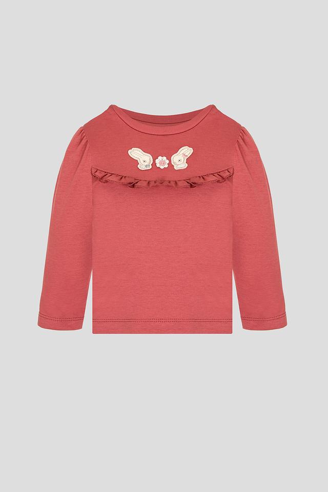 Футболка имеет длинные рукава и круглый вырез горловины, украшенный нежной рюшью. Особый шарм изделию придаёт вышитый принт в виде двух милых зайчиков и цветочка, расположенных на груди.