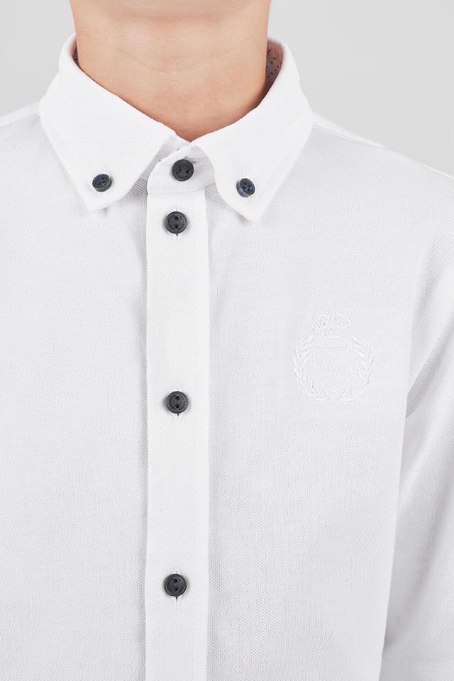 - Дизайн и детали: Белоснежный цвет в сочетании с контрастными тёмными пуговицами и декоративными налокотниками придаёт рубашке стильный и современный вид, выделяя её среди других моделей.