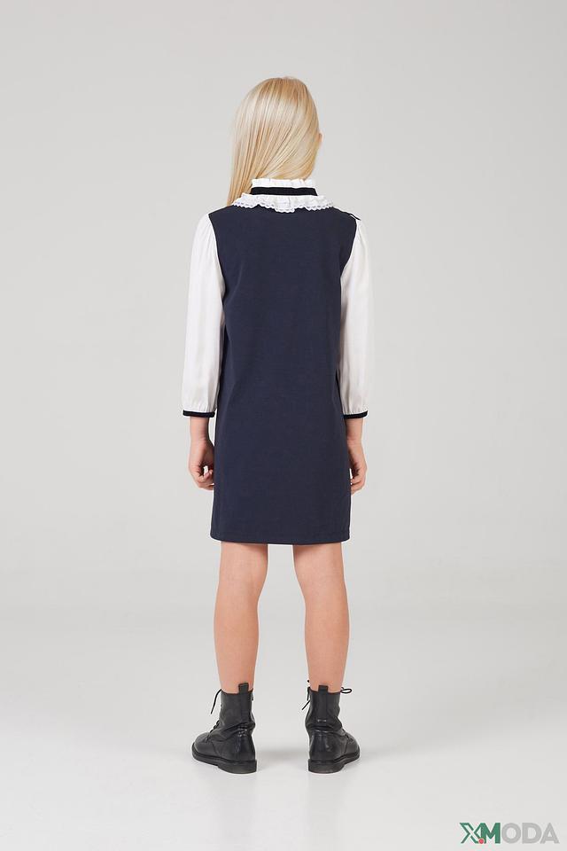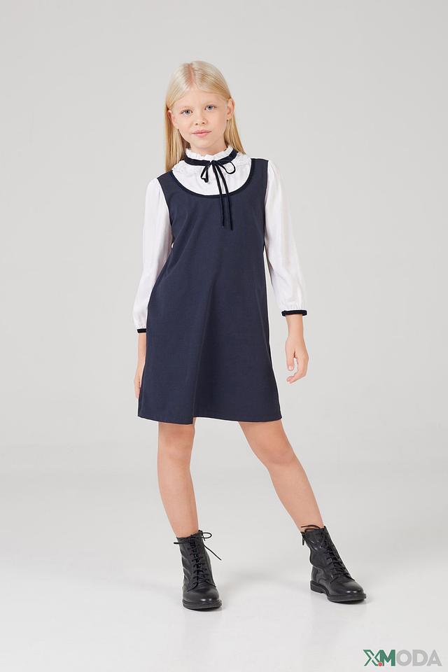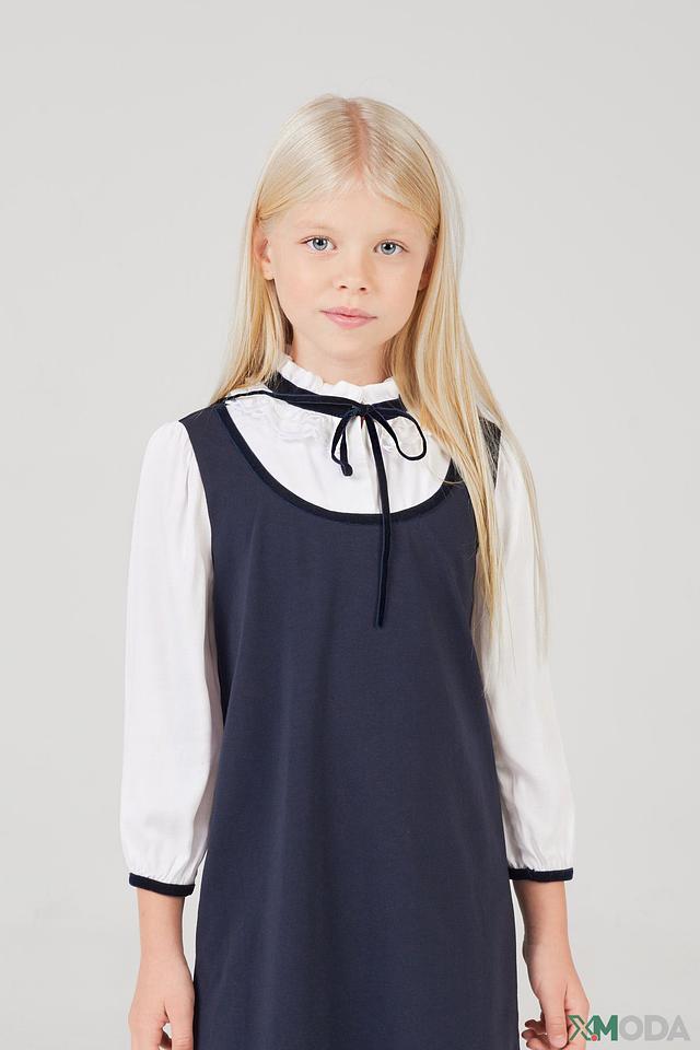 Сарафан имеет прямой силуэт и удобную длину, не сковывающую движения. Белая рубашка с воротничком и завязками добавляет платью изысканности и позволяет регулировать посадку по фигуре. Отделка белой полосой по краю рукавов и горловины сарафана придает завершенность образу.