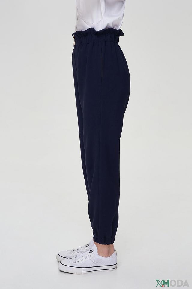 Брюки характеризуются высокой посадкой с широкой эластичной резинкой, декорированной двумя золотистыми пуговицами. Пояс обеспечивает комфортную посадку и подчеркивает талию. Широкие штанины, сужающиеся к низу на мягкой резинке, создают современный и расслабленный силуэт.
