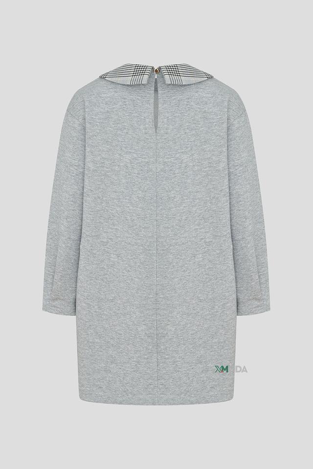 Платье имеет прямой крой, который не сковывает движения, и длинные рукава, обеспечивающие комфорт в прохладную погоду. Особый акцент сделан на оригинальном воротнике в клетку, который добавляет образу изысканности.