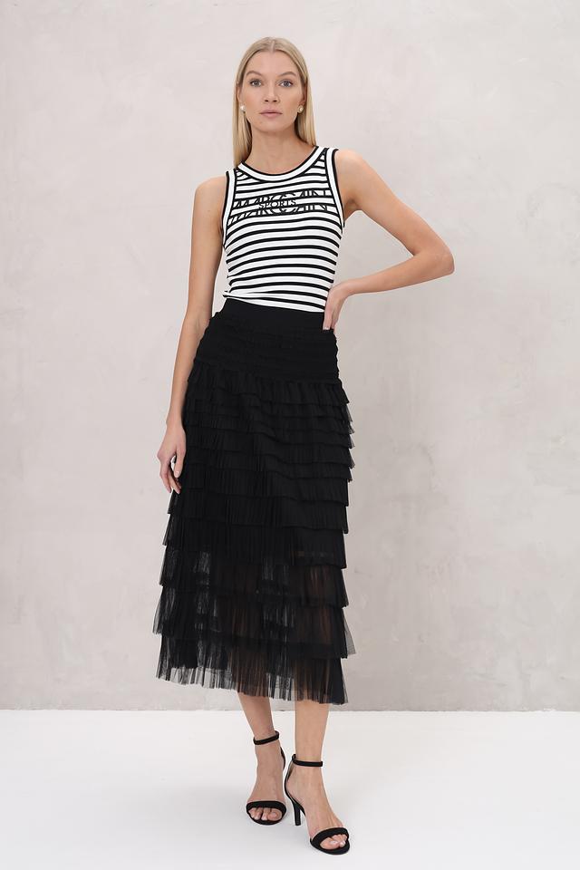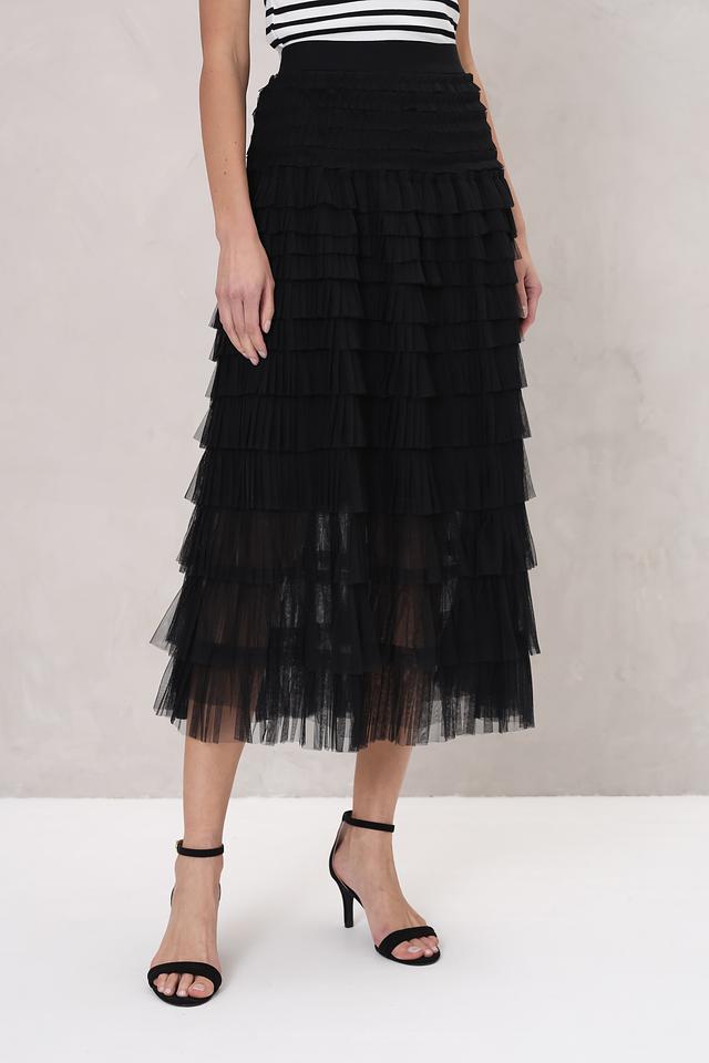 Юбка имеет многослойную конструкцию с оборками, создающими эффект лёгкости и воздушности. Чёрный цвет делает её универсальным элементом гардероба, который легко сочетается с различными топами и обувью.