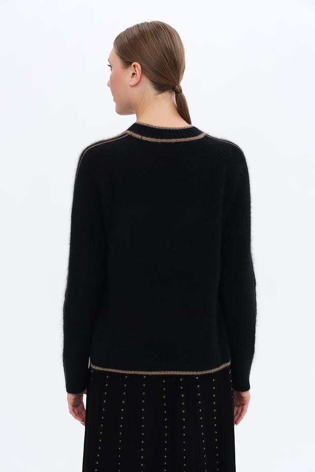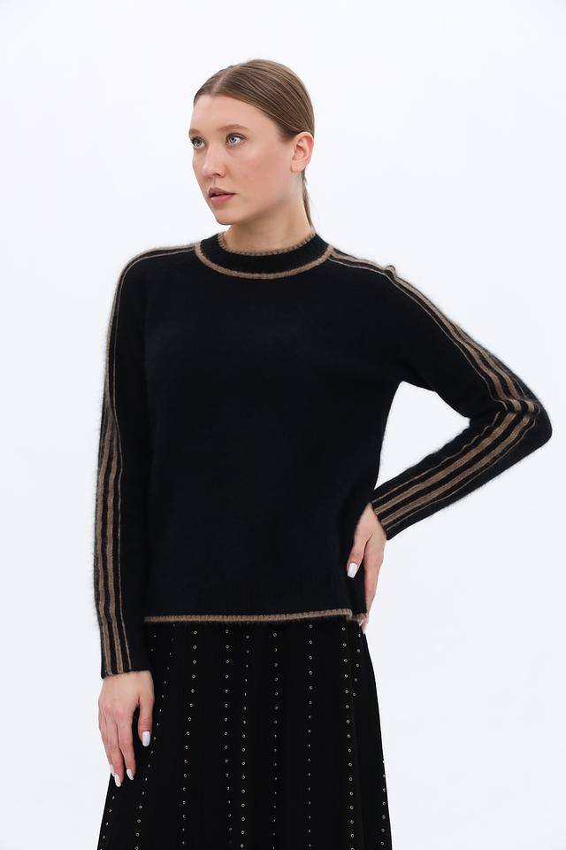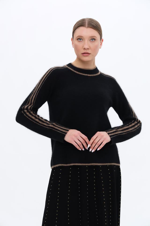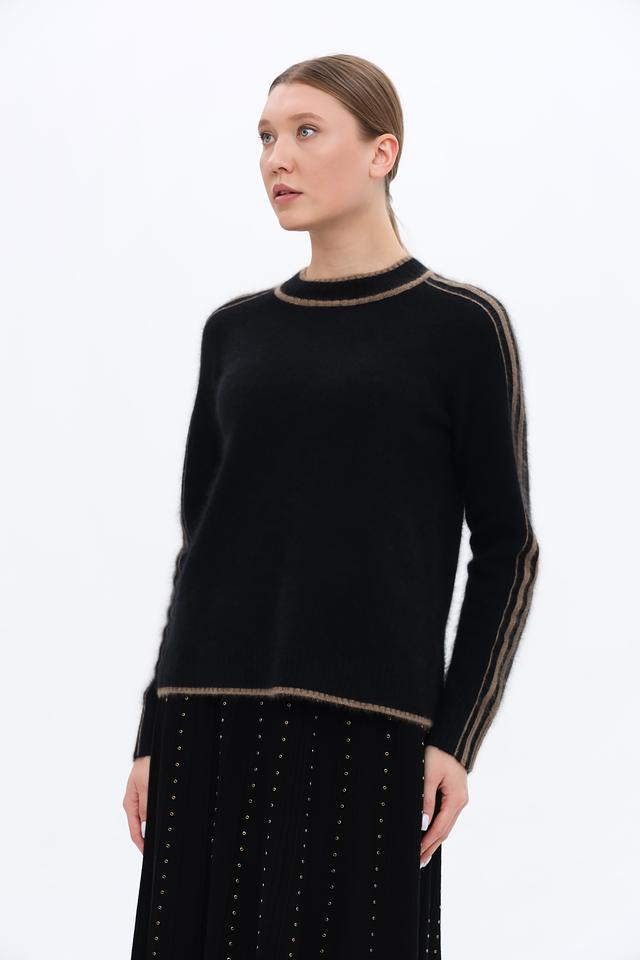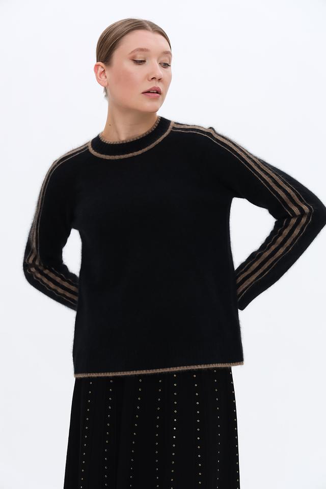 Чёрный джемпер от Leo & Ugo с полоской по горловине и рукавам. Изготовлен из мягкой смеси пуха, нейлона, вискозы и шерсти, обеспечивающей комфорт и тепло. Стильный и универсальный выбор для создания повседневных образов. Состав: пух 50%, нейлон 20%, вискоза 20%, шерсть 10%