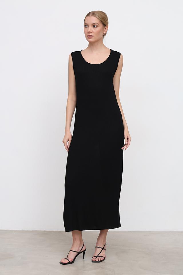 Платье имеет прямой, приталенный силуэт, который подчеркивает фигуру. Круглый вырез горловины и отсутствие рукавов делают его идеальным для тёплой погоды.