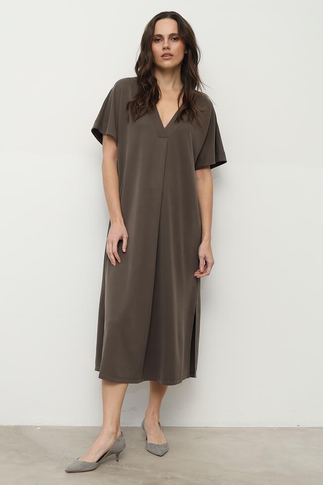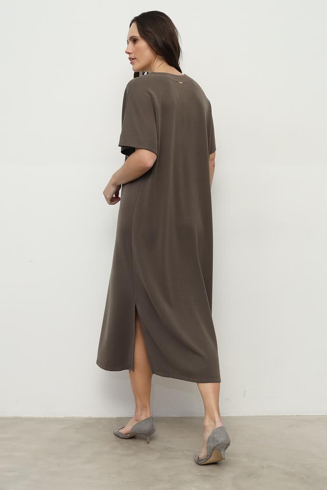 Платье имеет длину миди и выполнено в спокойном сером цвете, который легко сочетается с различными аксессуарами и обувью. Разрез сзади добавляет образу динамичности и позволяет чувствовать себя комфортно в движении. Это платье станет отличным выбором для создания стильного и непринужденного образа.