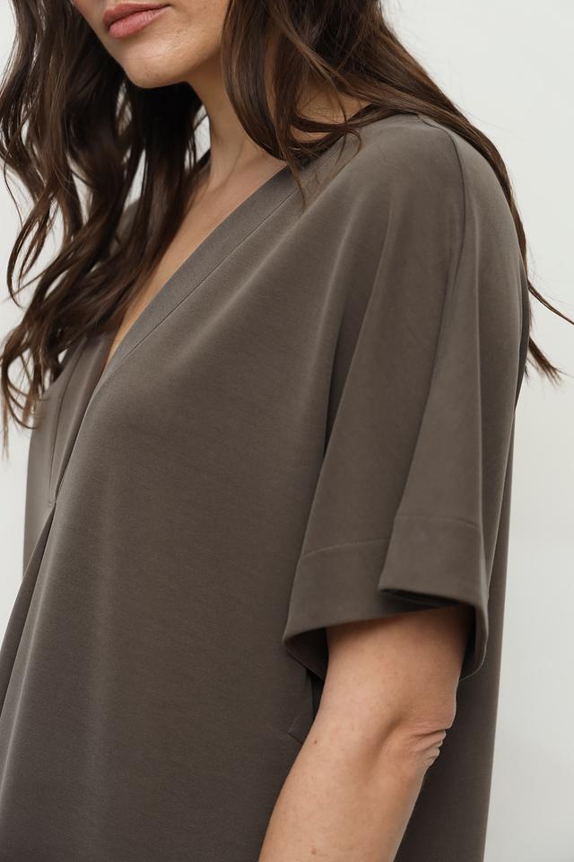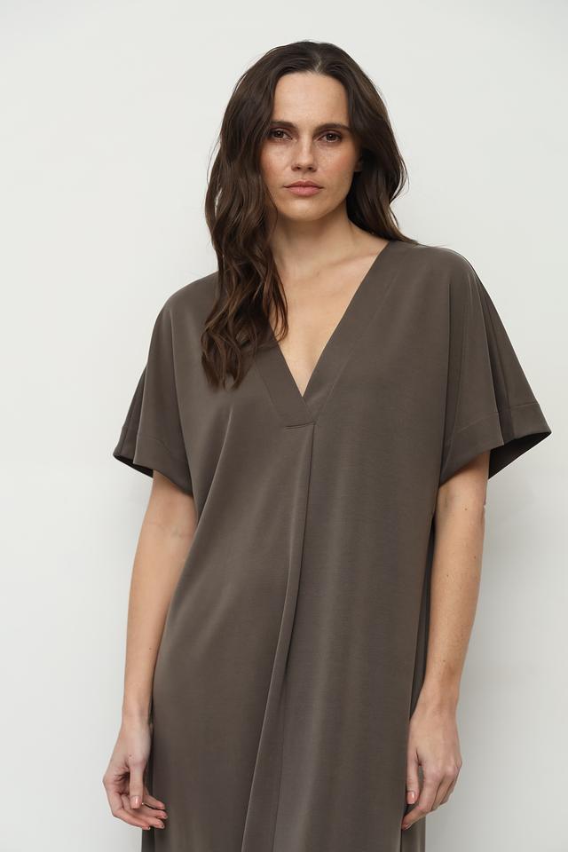 Модель имеет прямой, слегка свободный крой, который не сковывает движений и позволяет создать расслабленный образ. V-образный вырез горловины визуально удлиняет шею и делает силуэт более изящным. Короткие рукава добавляют платью лёгкости.
