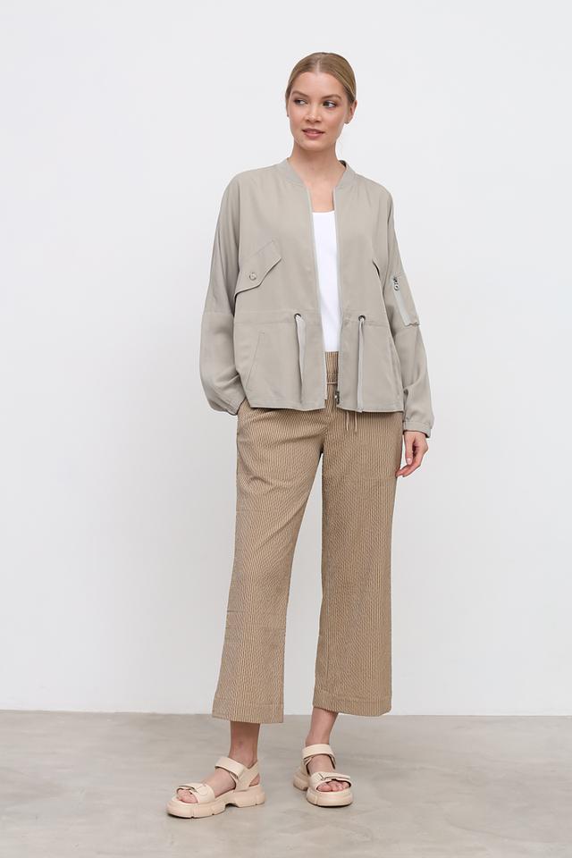 Брюки имеют прямой крой и зауженный книзу силуэт, что делает их подходящими для различных типов фигур. Эластичный пояс с кулиской обеспечивает комфортную посадку и позволяет регулировать обхват талии. На брюках предусмотрены боковые карманы.