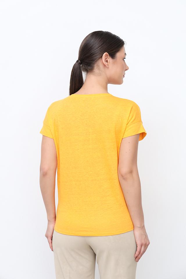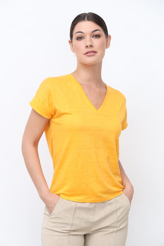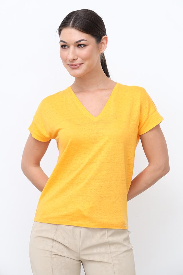 Женская футболка Cinque жёлтого цвета выполнена из 100% льна. Модель имеет V-образный вырез и короткий рукав с небольшим отворотом, что придает ей лёгкий и непринужденный вид. Состав: лен 100%
