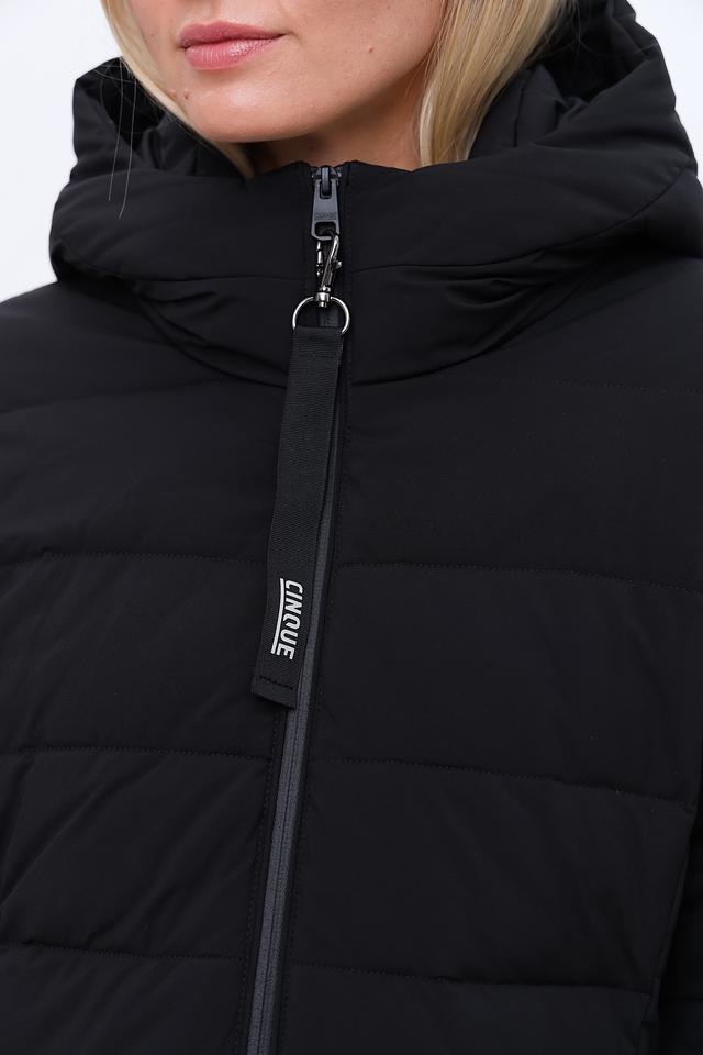 Чёрное стеганое пальто от Cinque – это стильное и практичное решение для прохладной погоды. Модель имеет капюшон и застегивается на молнию, обеспечивая защиту от ветра и холода. Состав: полиамид 88%, эластан 12%