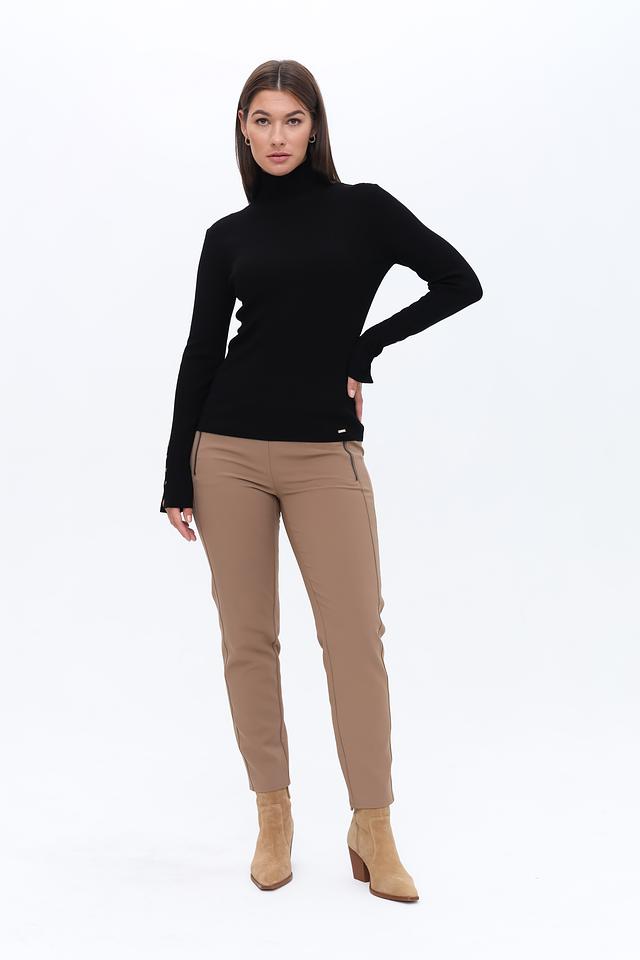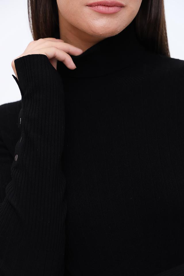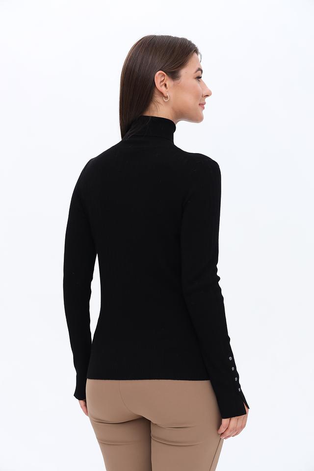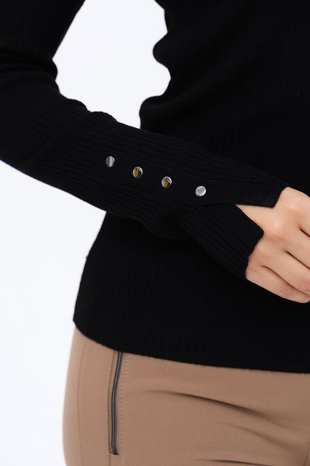 Пуловер имеет облегающий силуэт и длинный рукав, который заканчивается манжетой, украшенной аккуратными пуговицами. Воротник-стойка добавляет элегантности и защищает от холода.