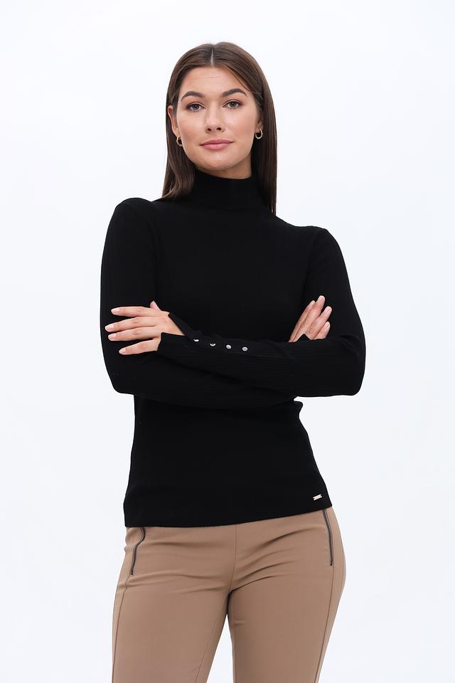 Чёрный пуловер от Cinque с длинным рукавом и воротником-стойкой. Изготовлен из мягкой вискозы с добавлением полиамида, что обеспечивает комфорт и износостойкость. Декорирован пуговицами на манжетах. Состав: вискоза 80%, полиамид 20%